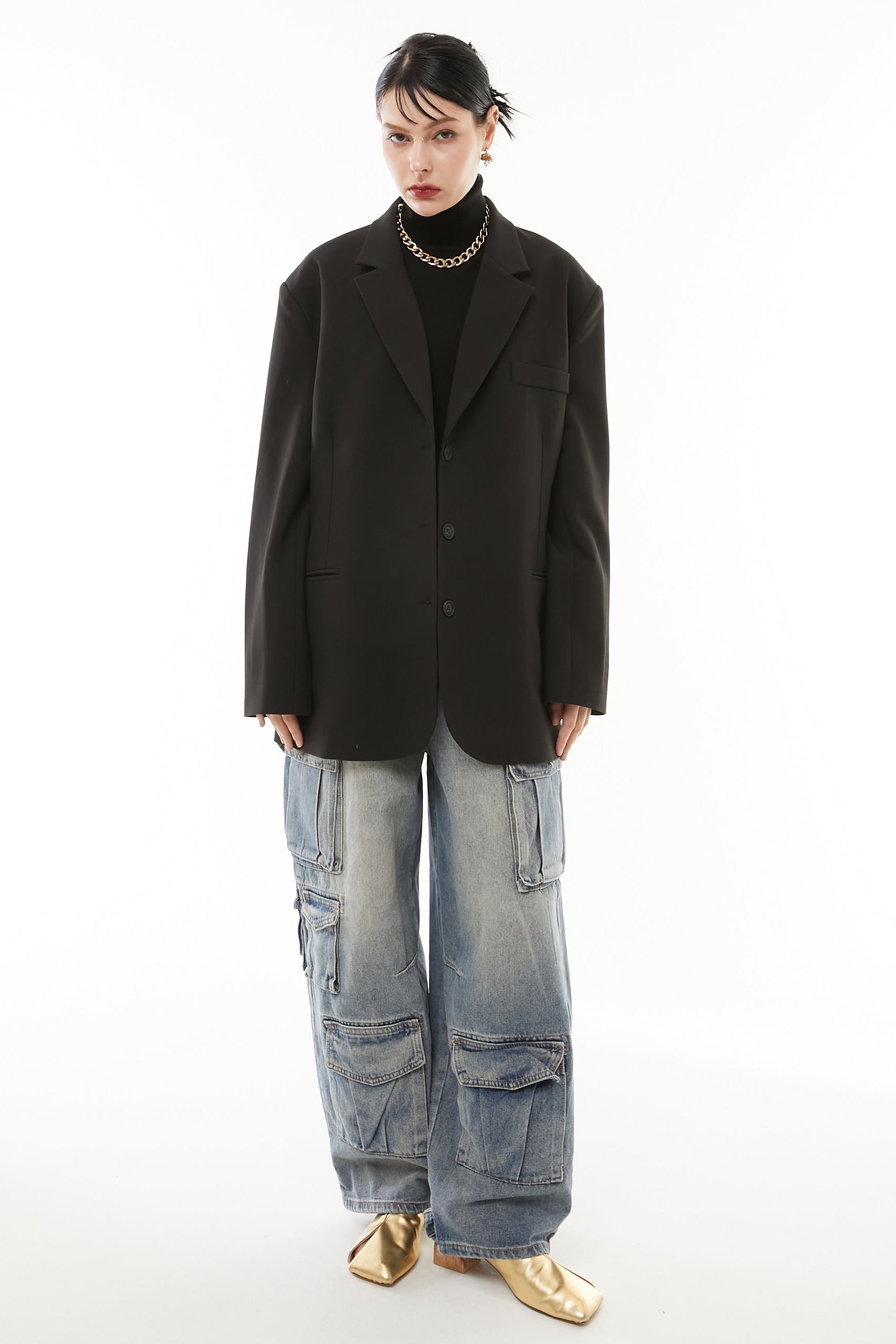 構築的なシルエットと程よい抜け感が同居する、オーバーサイズジャケット。肩幅と身幅にゆとりを持たせ、メンズライクな空気感と洗練を両立。グレーとブラックの2色展開で、季節や気分に合わせた着こなしが自在に楽しめる。