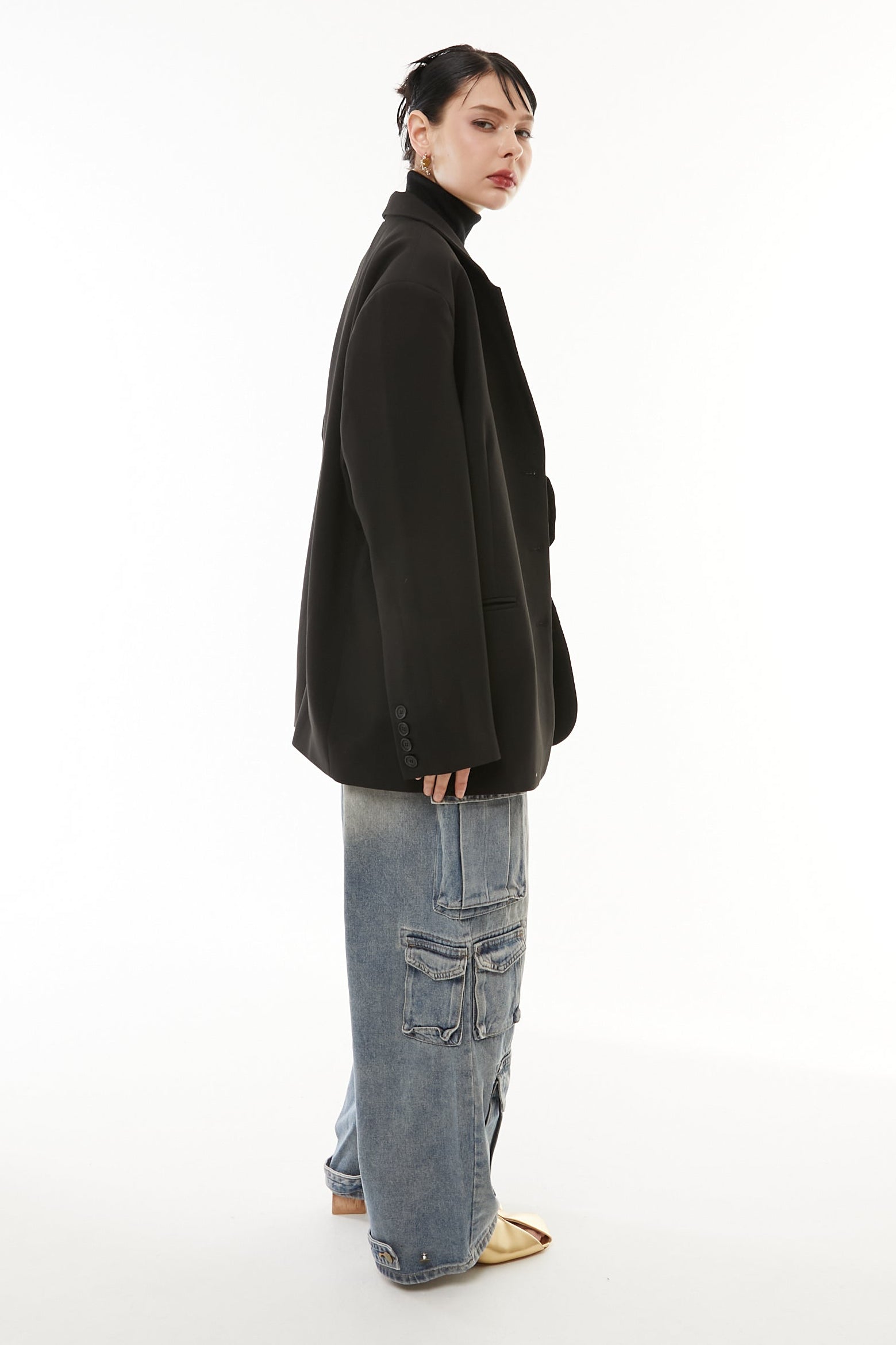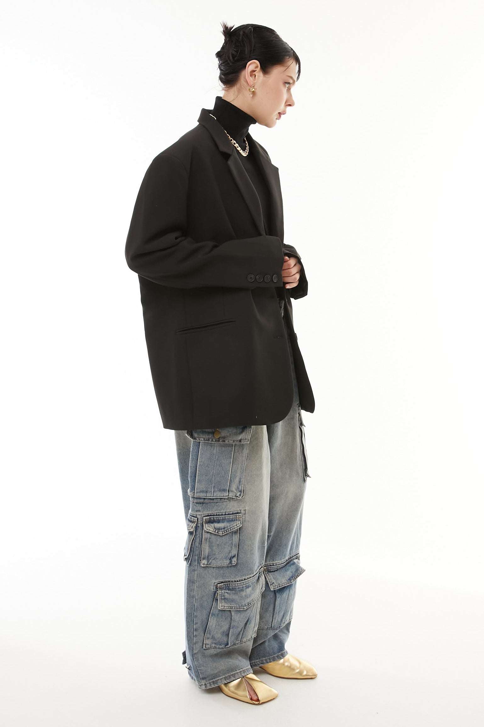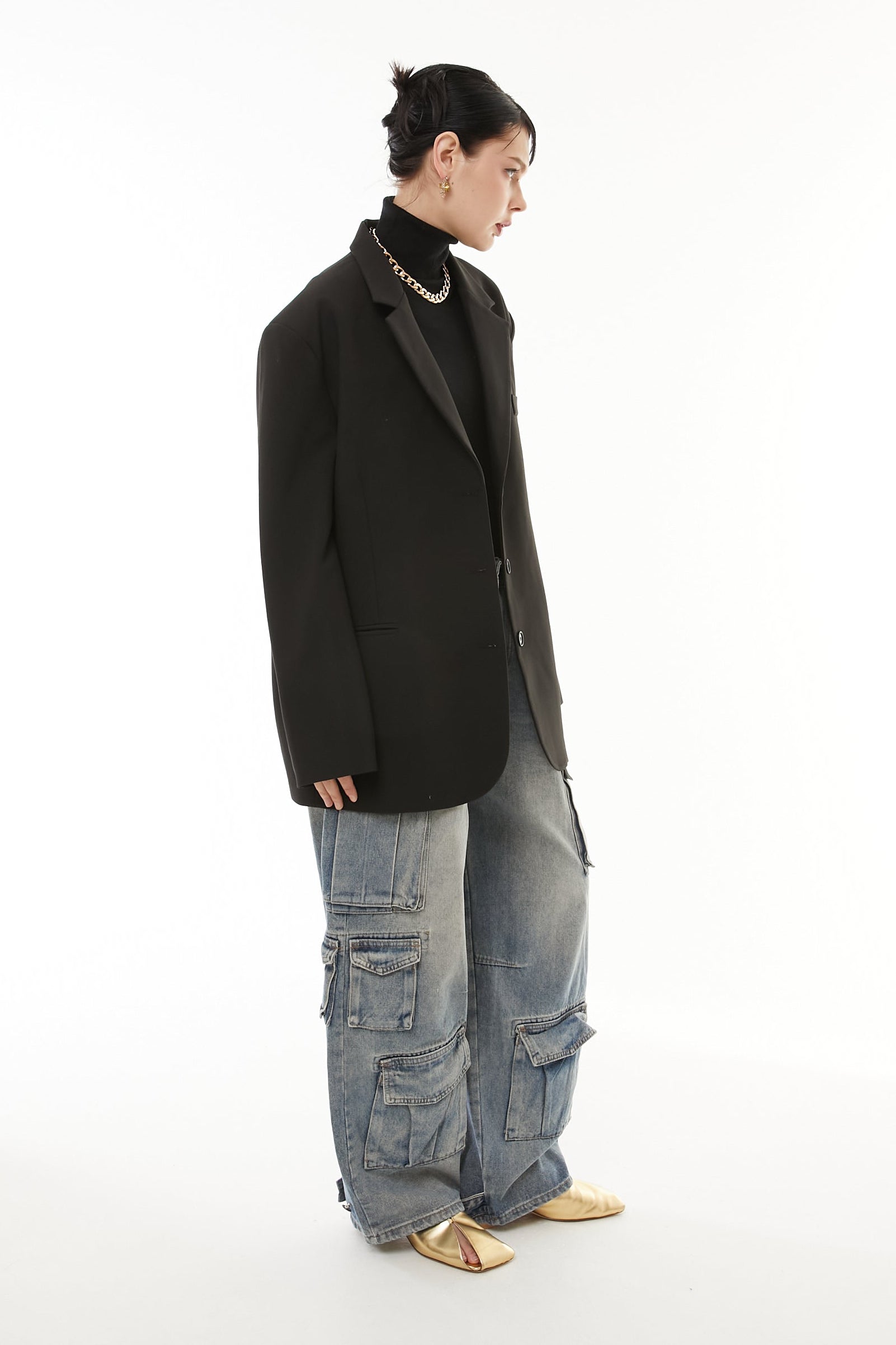 黒ジャケット+カーゴデニムで、モードとストリートのバランスが光る着こなし。チェーンネックレスで都会的なエッジを添えて。