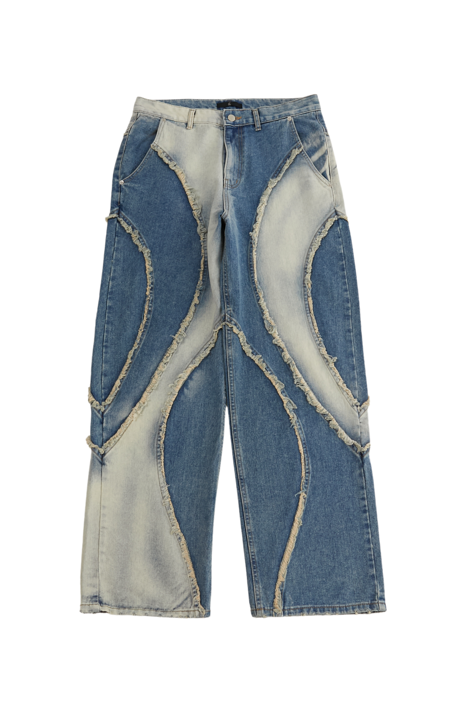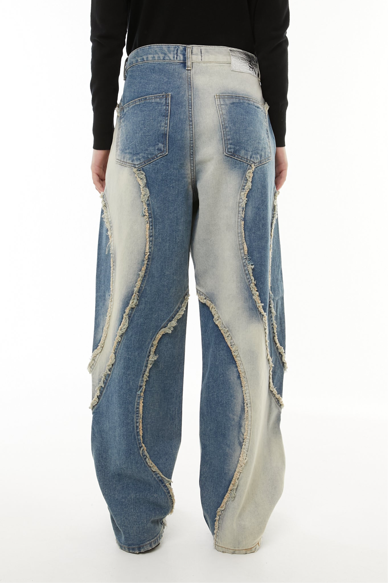まるで波打つように走る不規則なカットラインと、ラフにほつれた断ち切りの縁。
