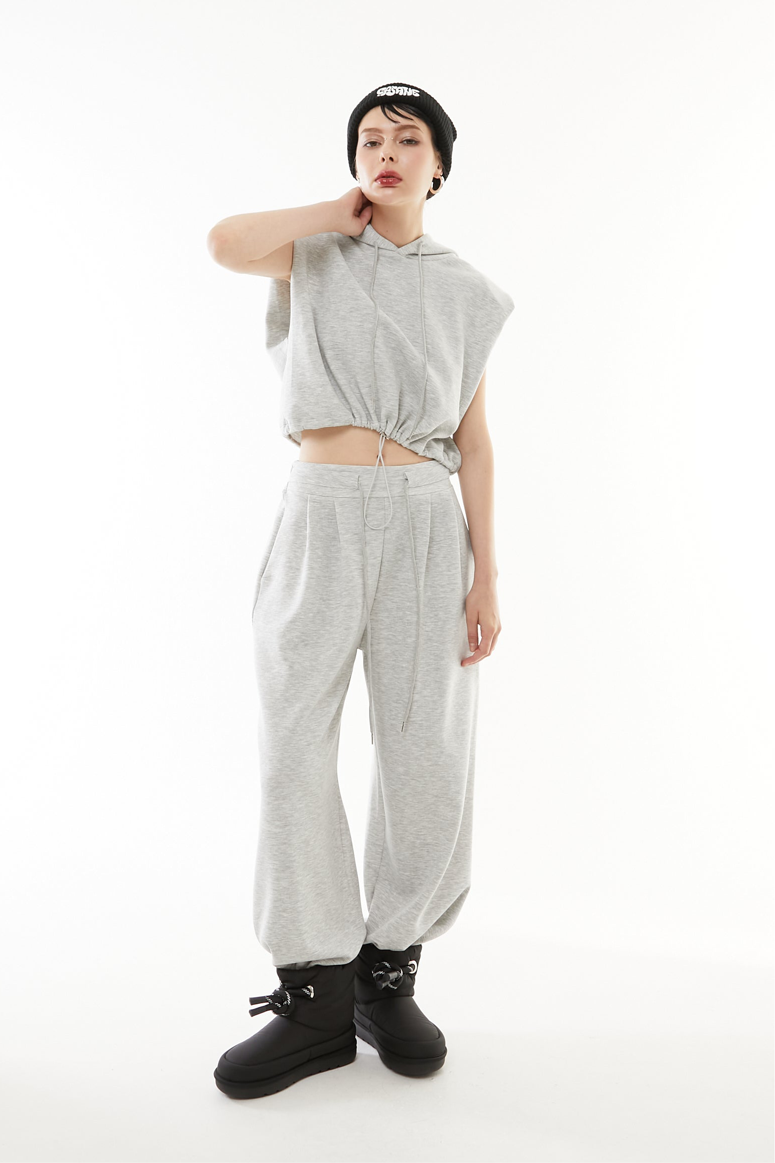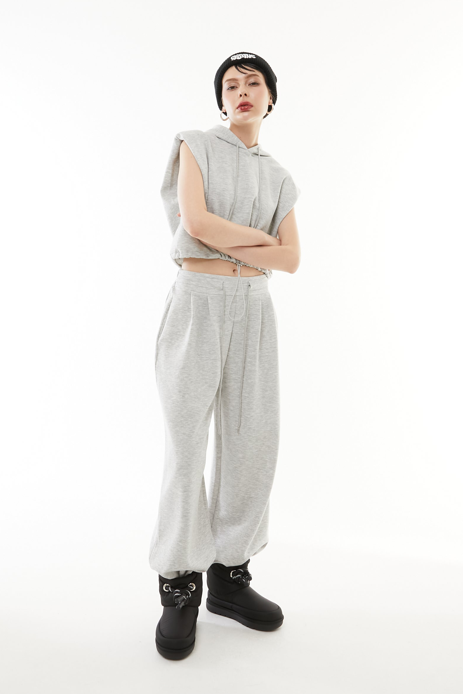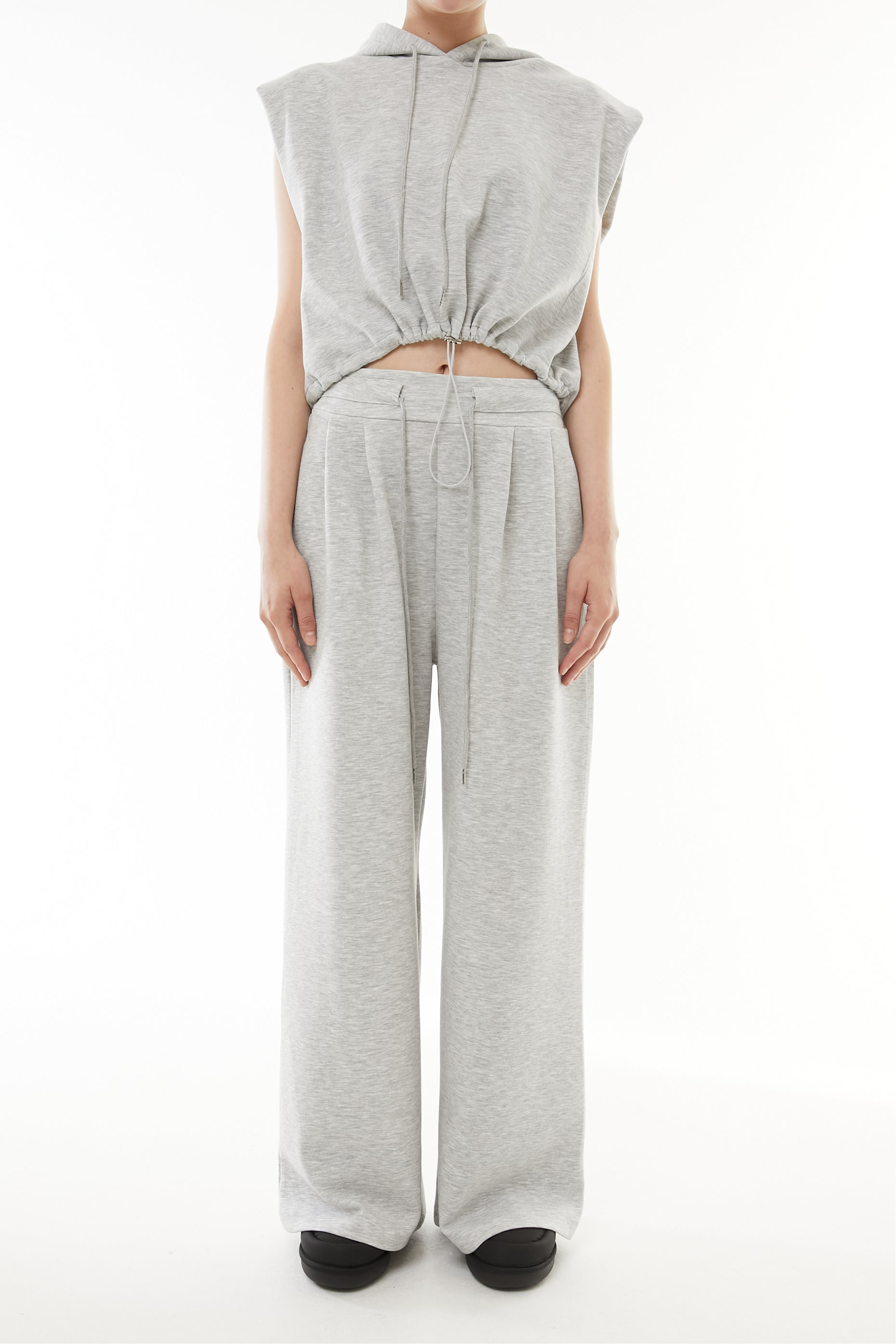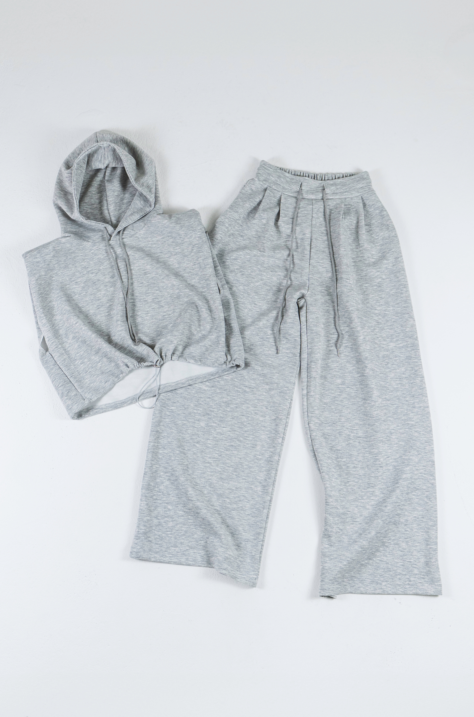 立体的なショート丈フーディと、美シルエットなワイドパンツの2点セットアップ。