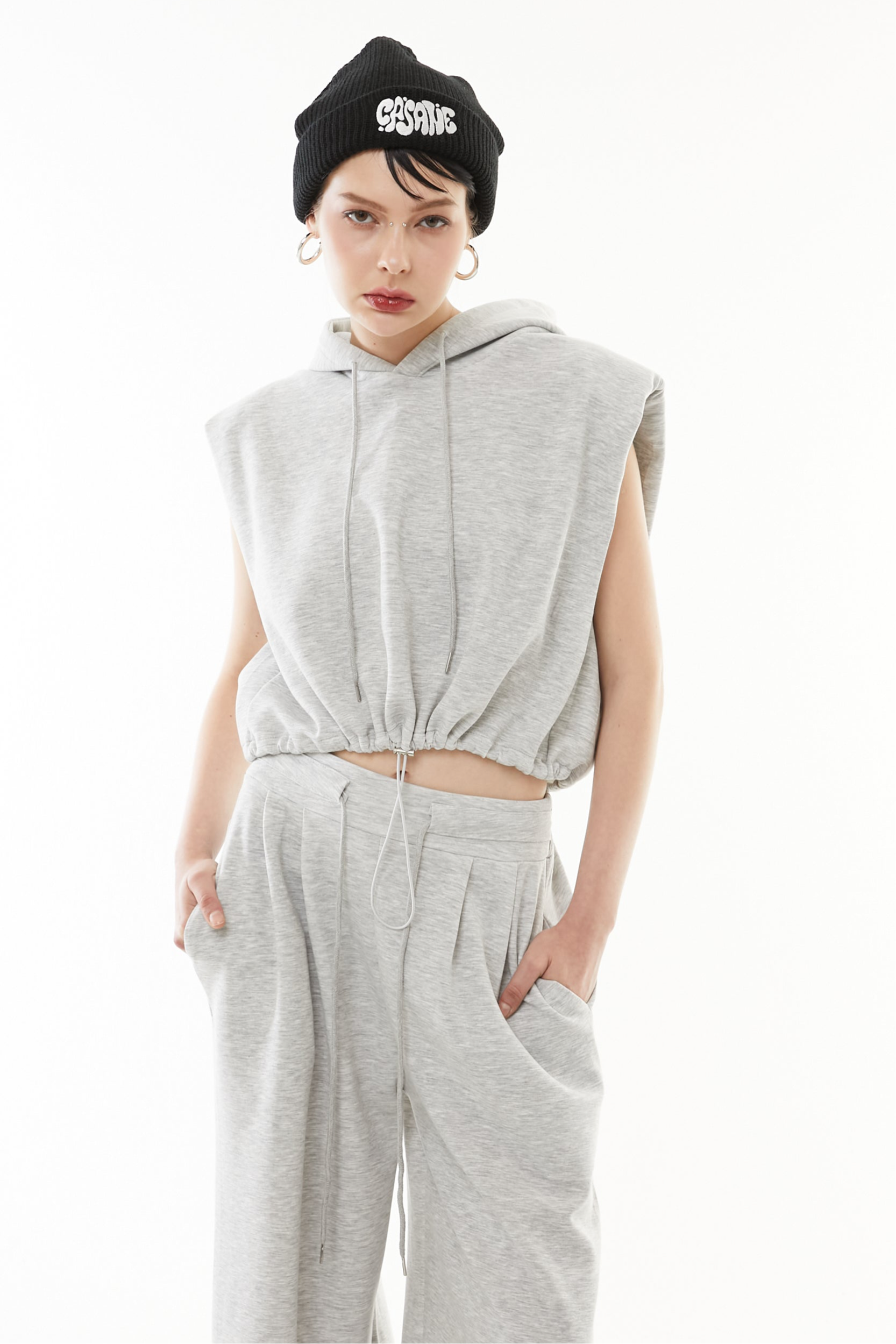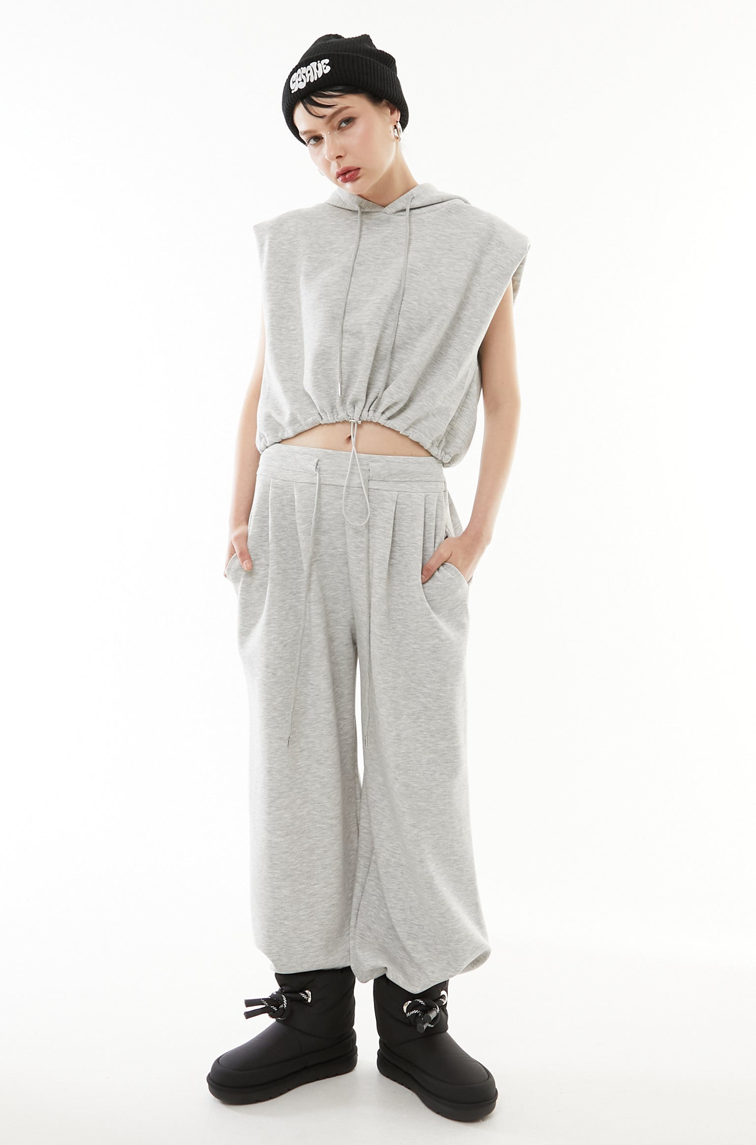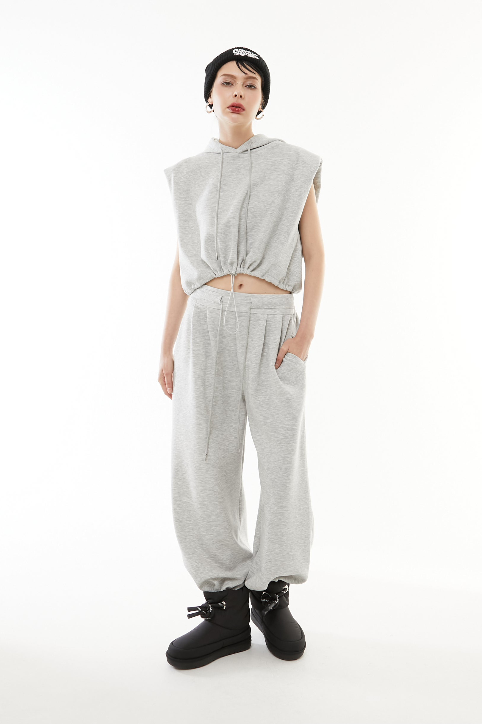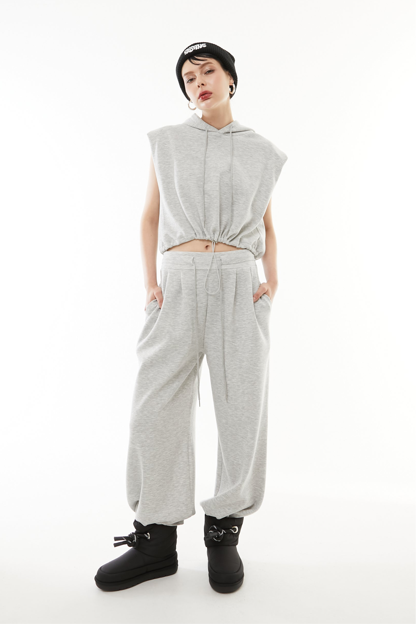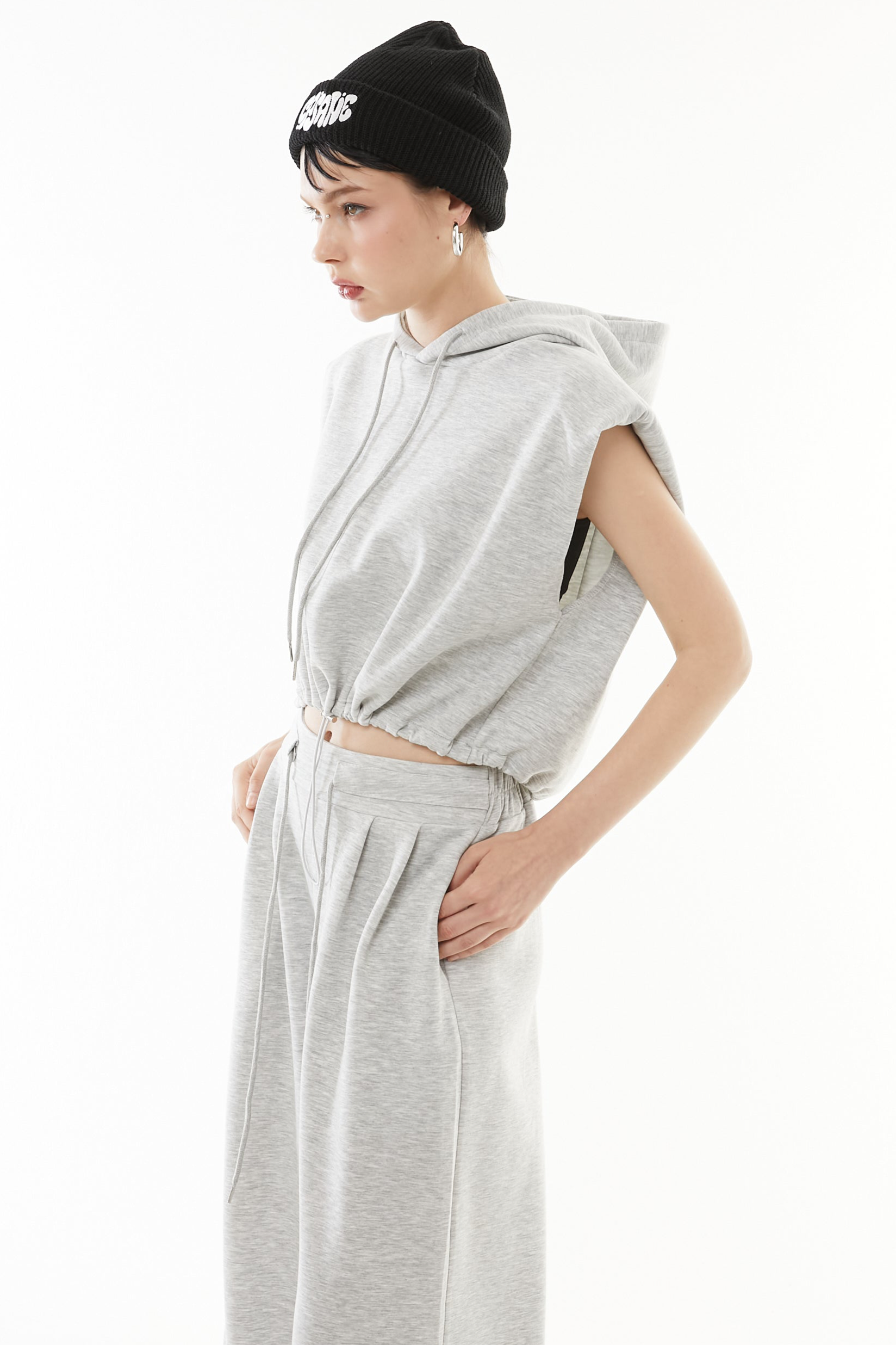 立体的なショート丈フーディと、美シルエットなワイドパンツの2点セットアップ。
