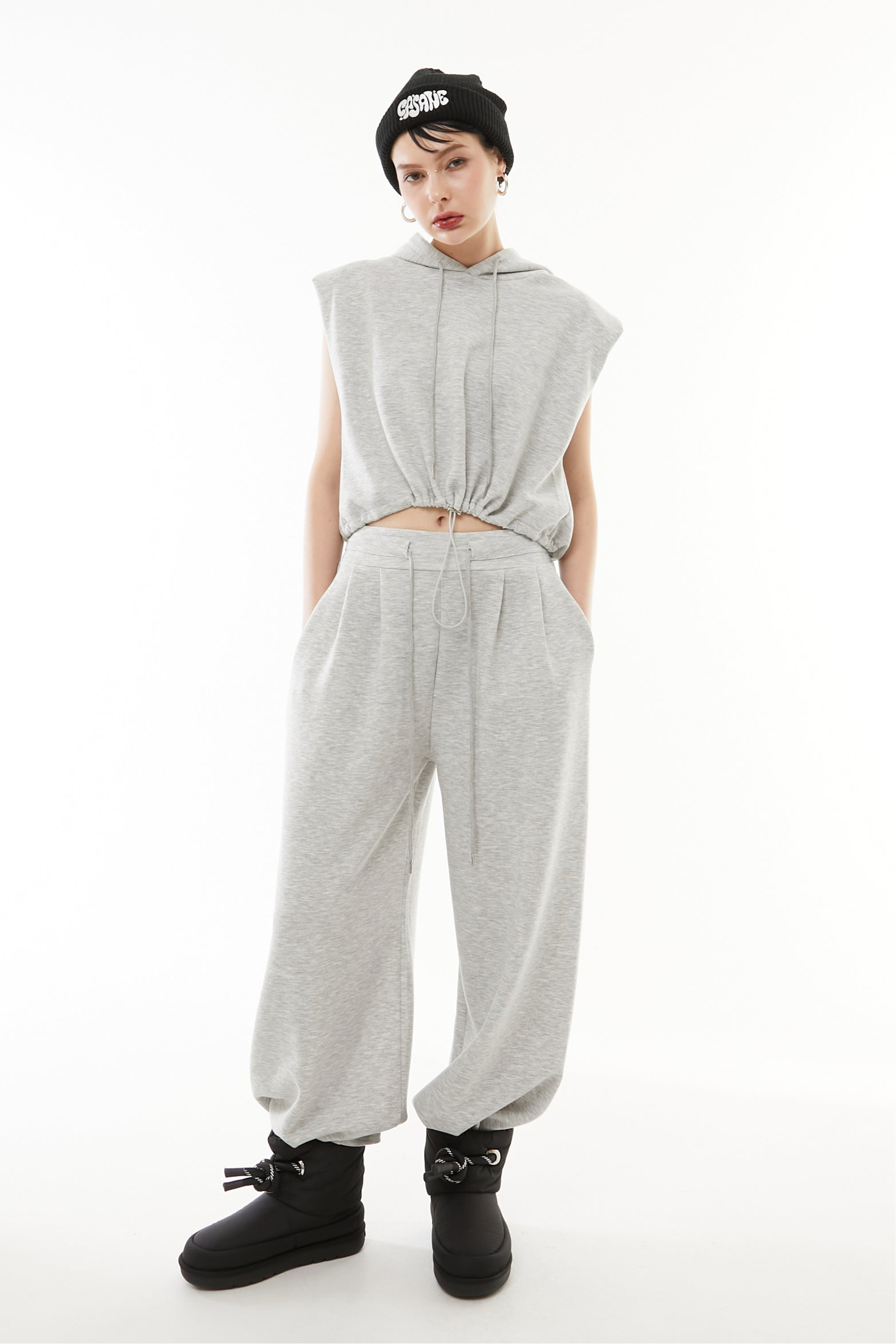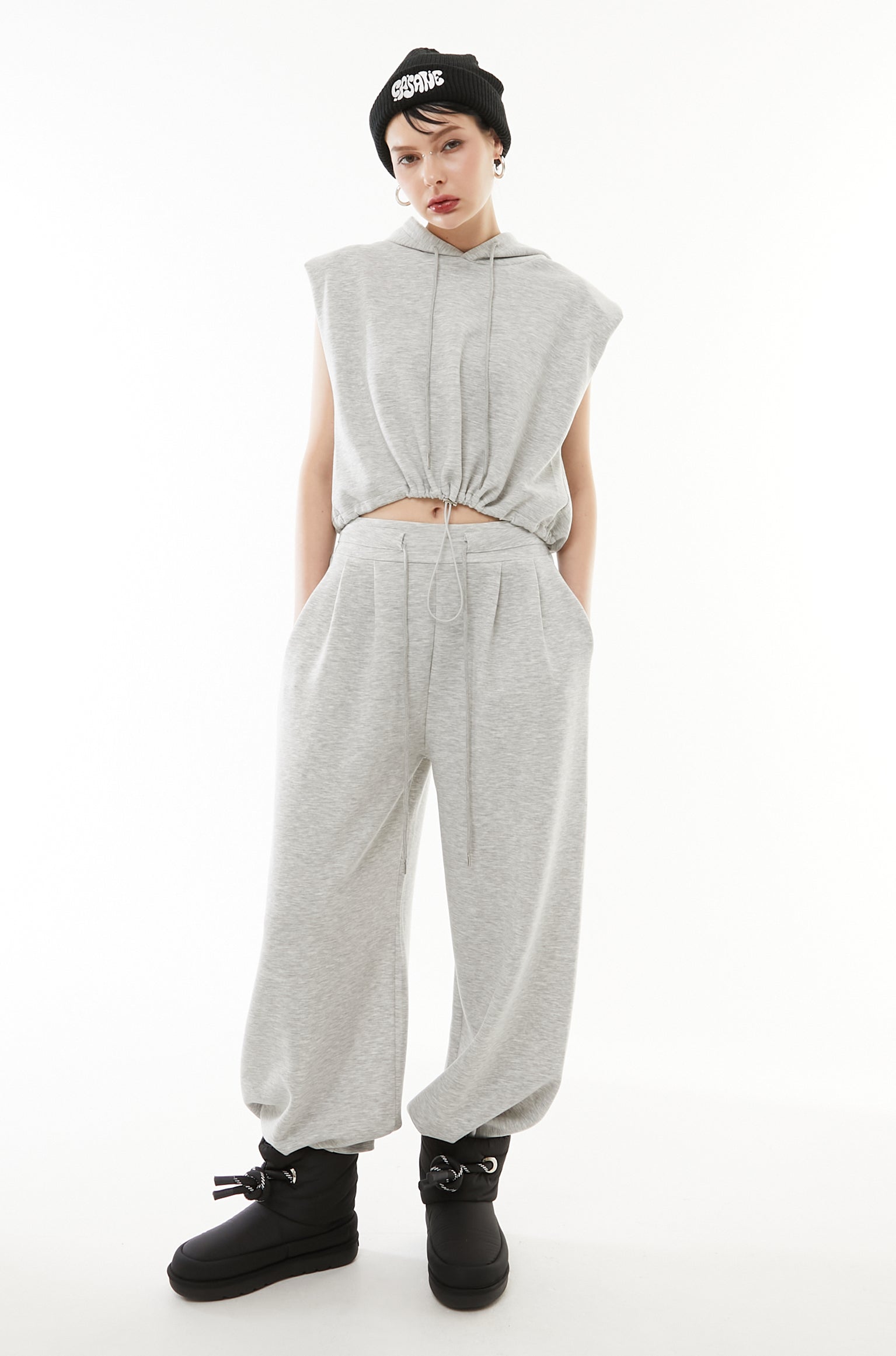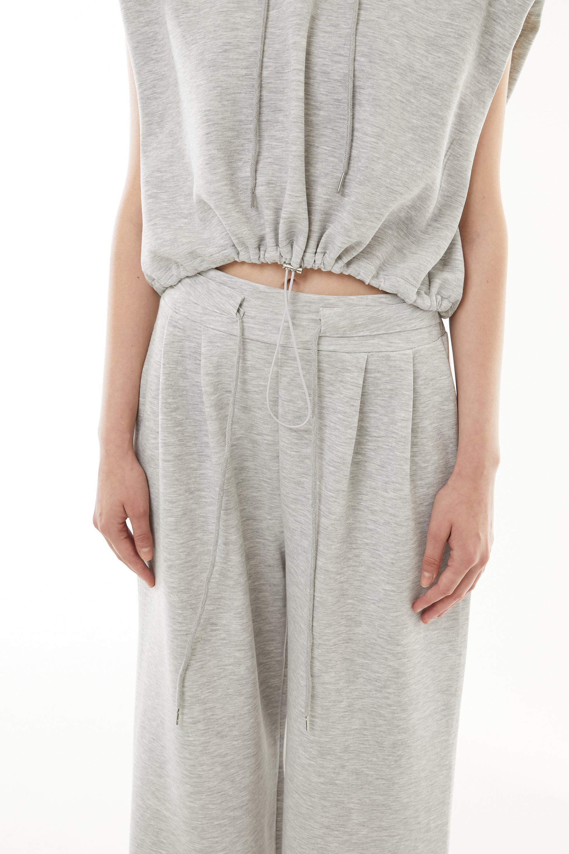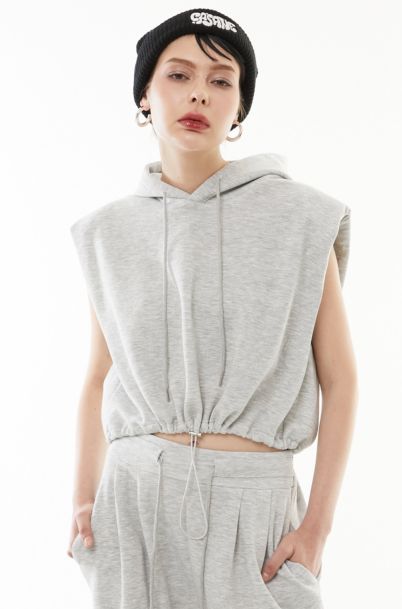 立体的なショート丈フーディと、美シルエットなワイドパンツの2点セットアップ。