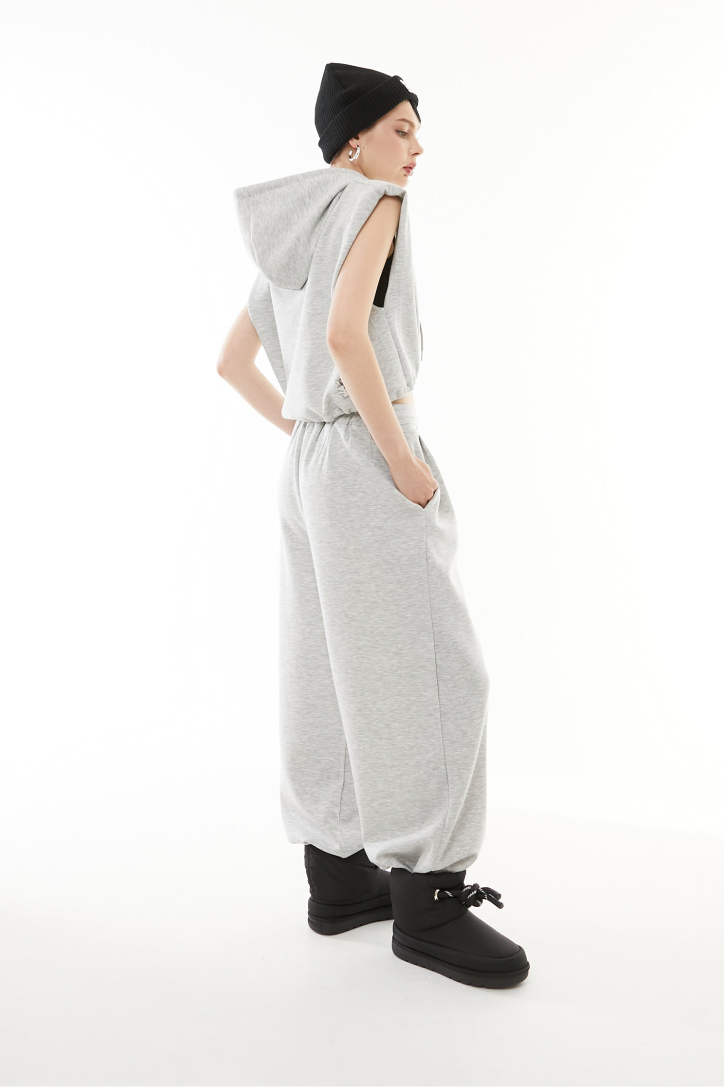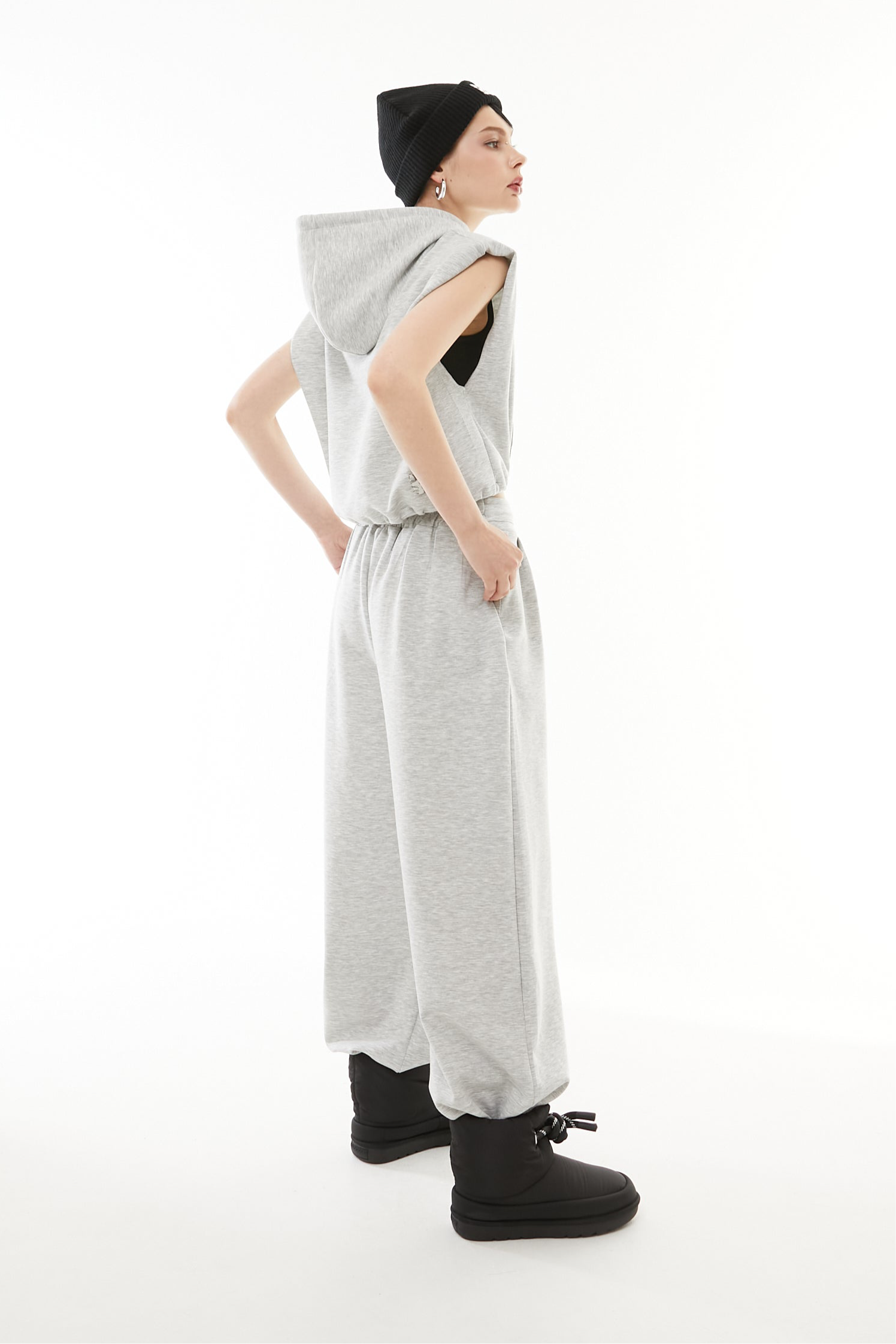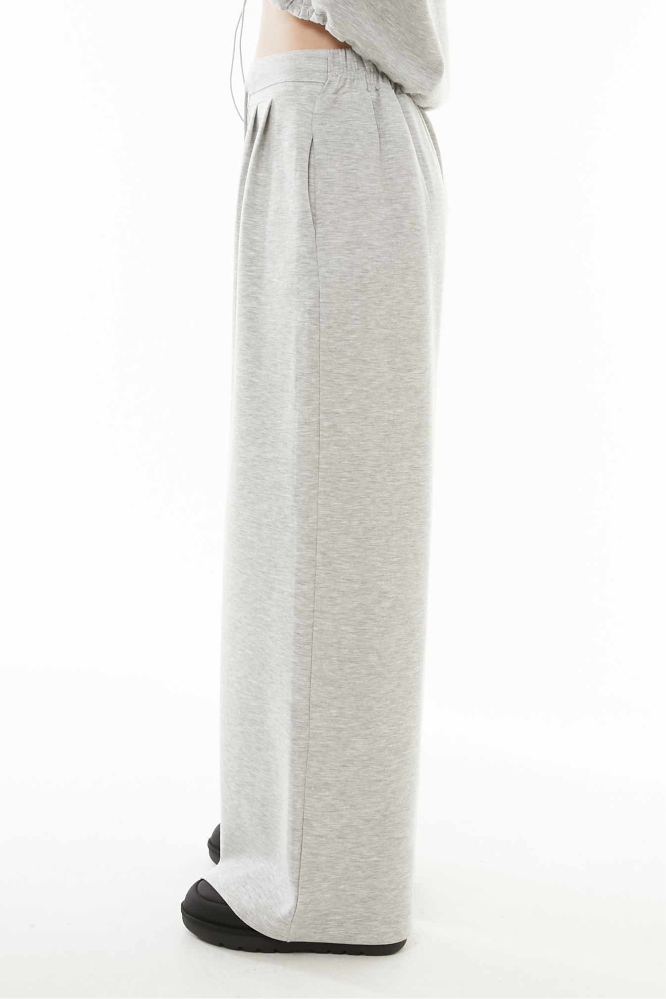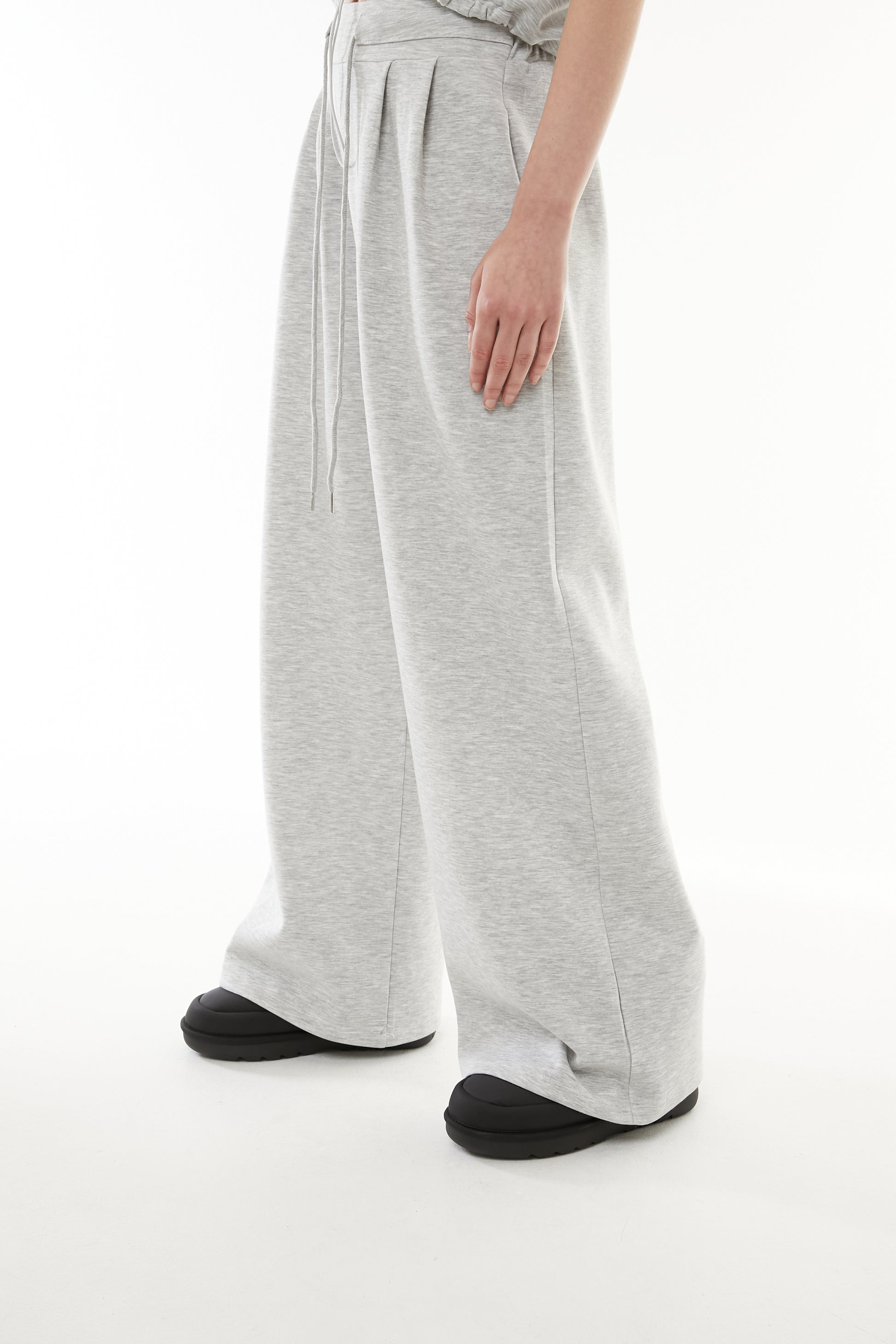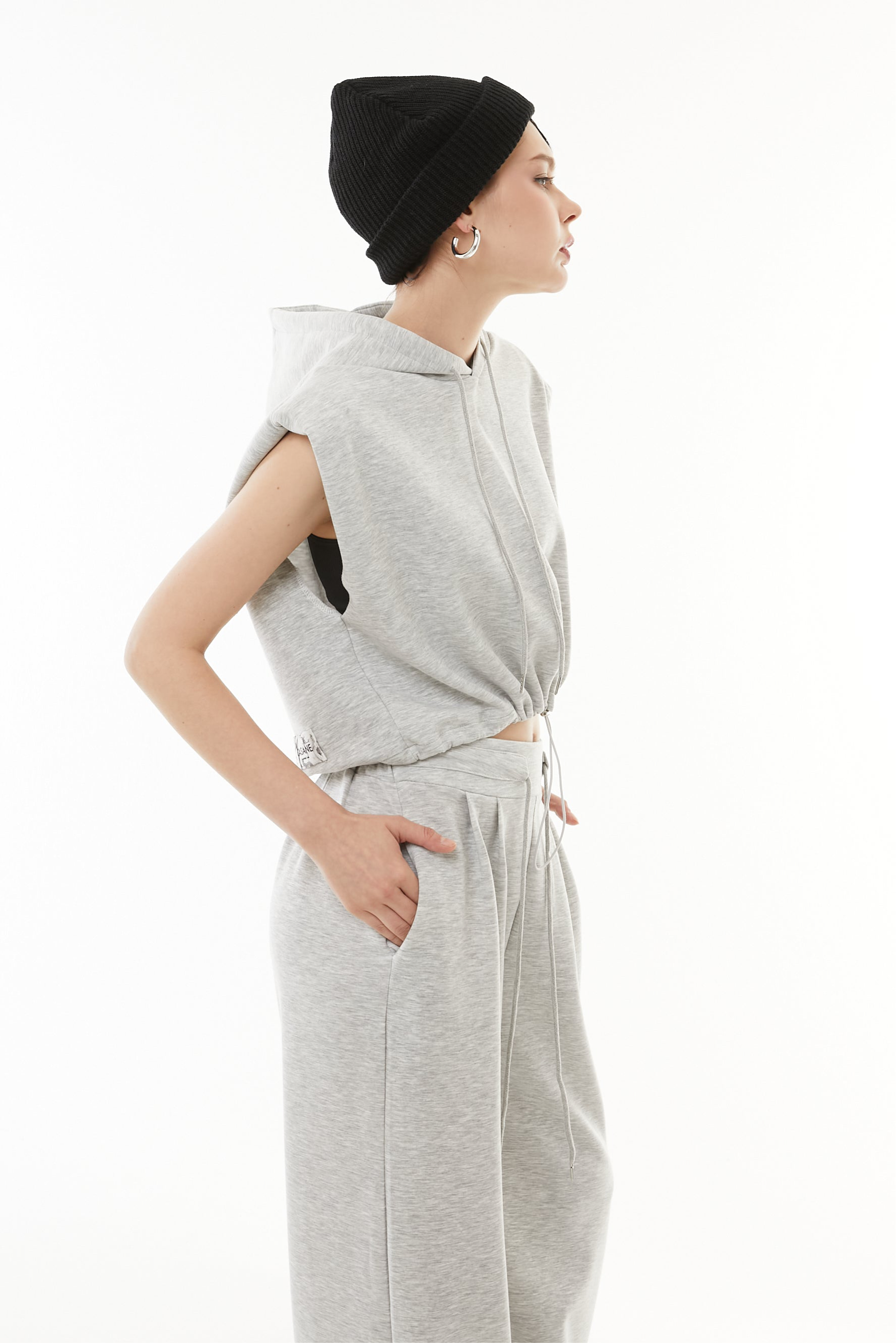 立体的なショート丈フーディと、美シルエットなワイドパンツの2点セットアップ。
