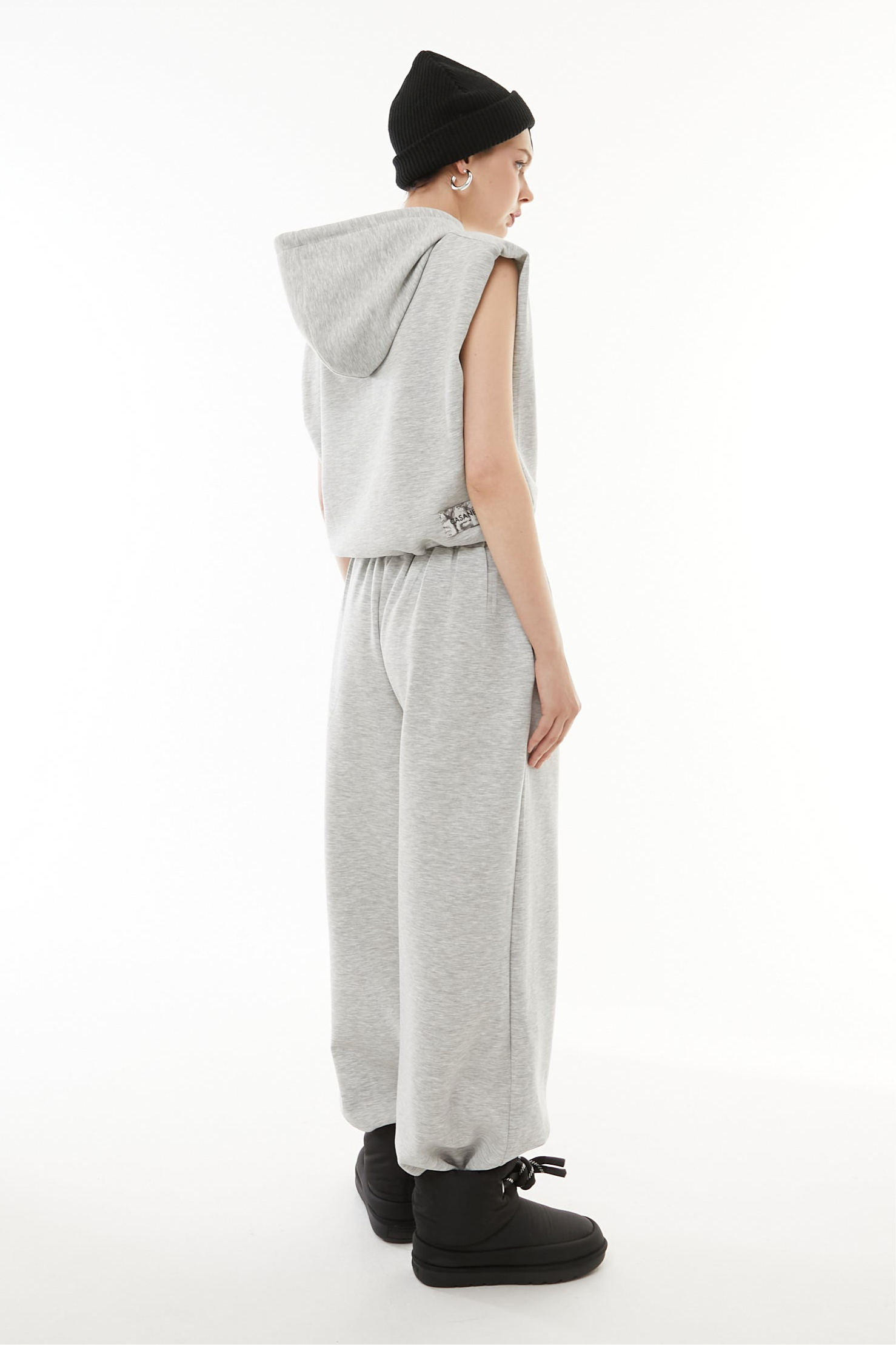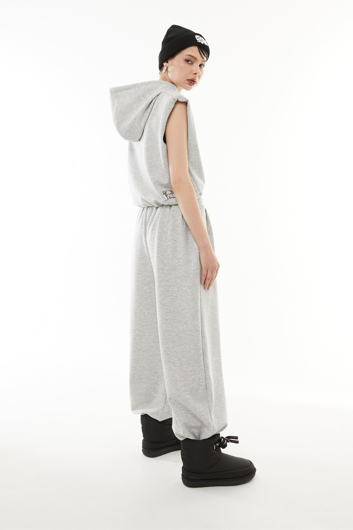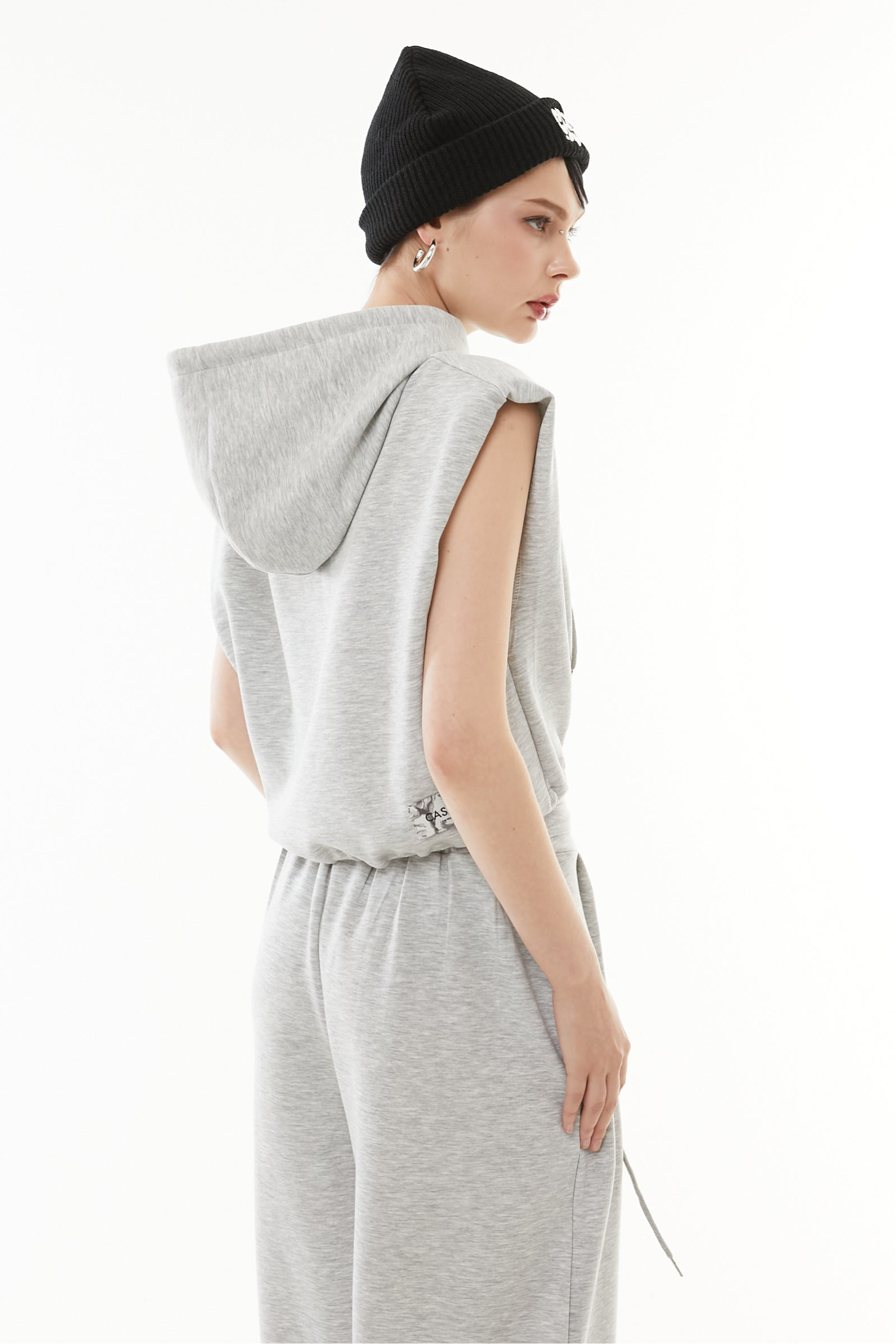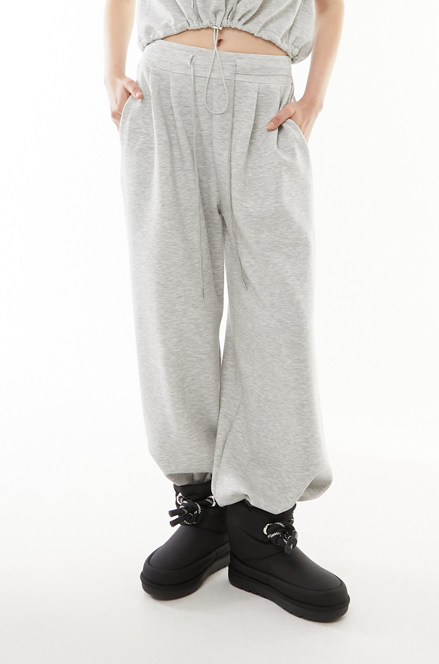 立体的なショート丈フーディと、美シルエットなワイドパンツの2点セットアップ。