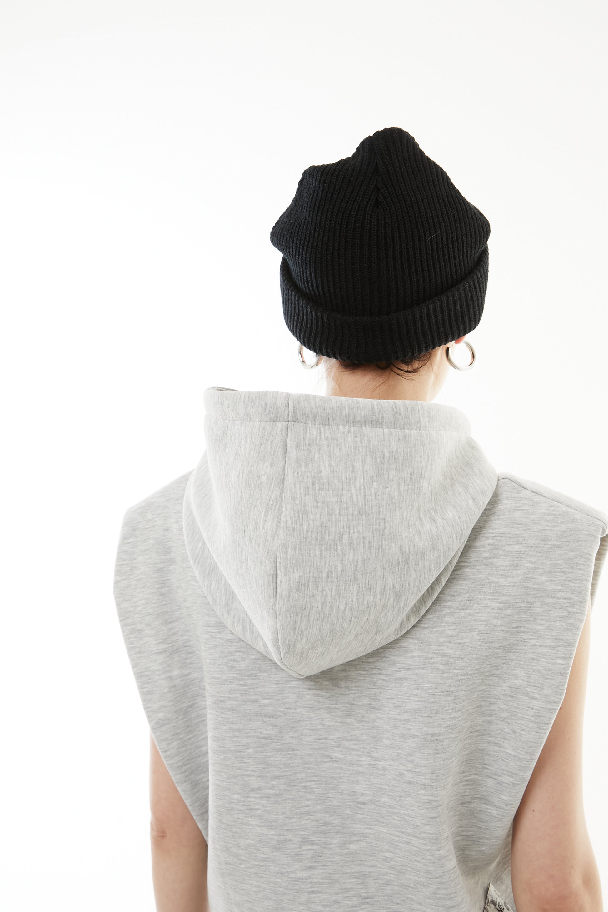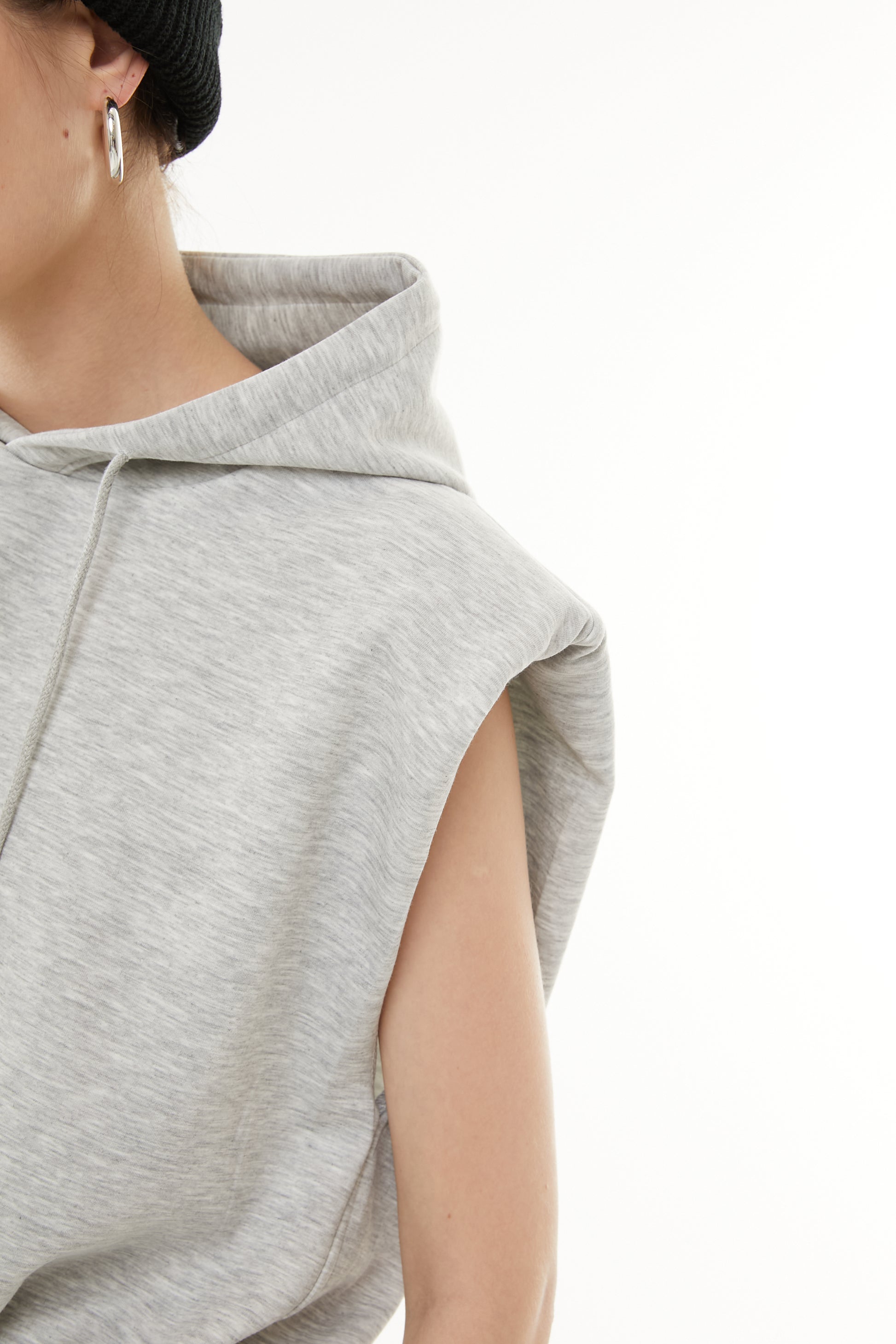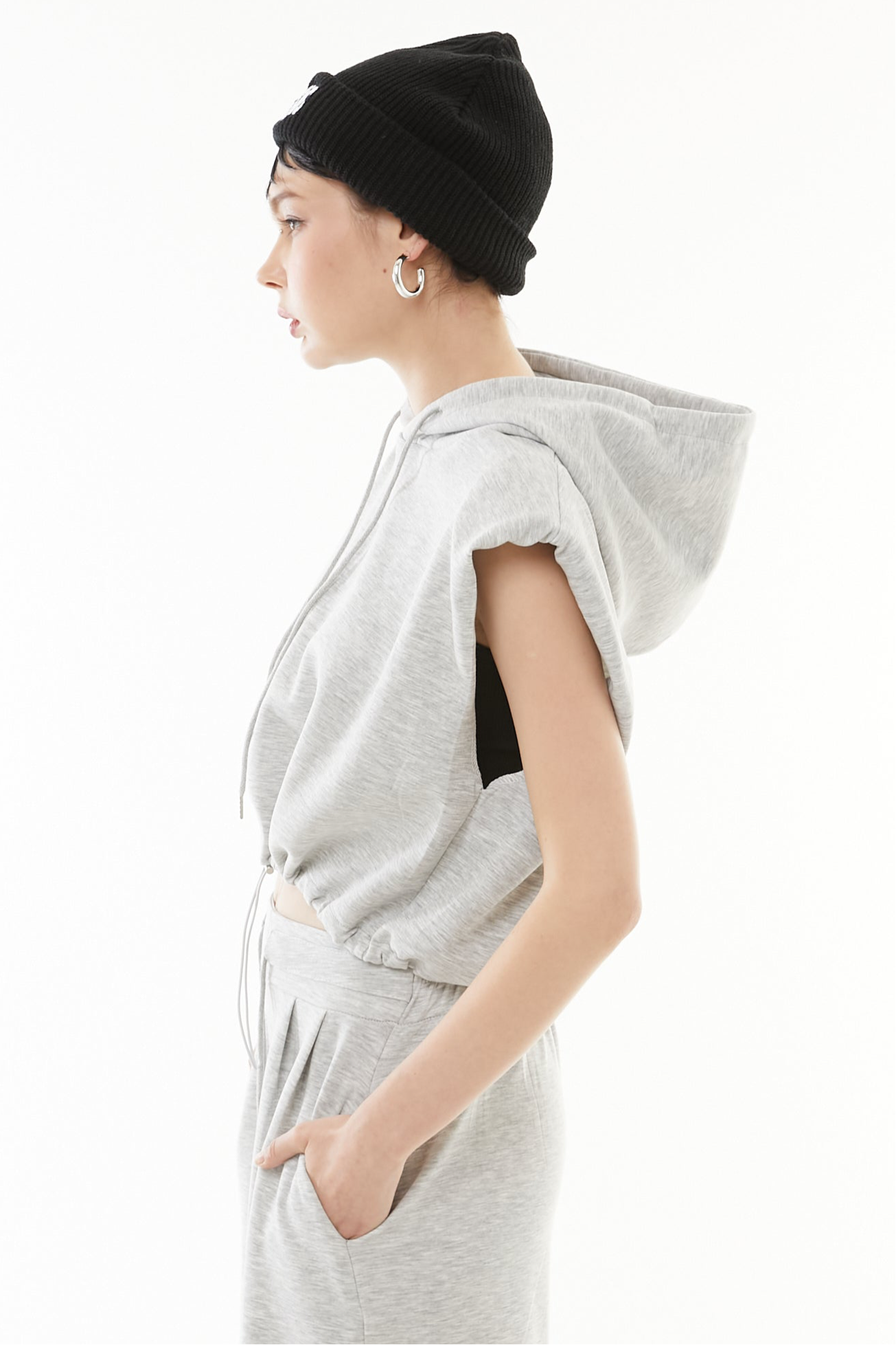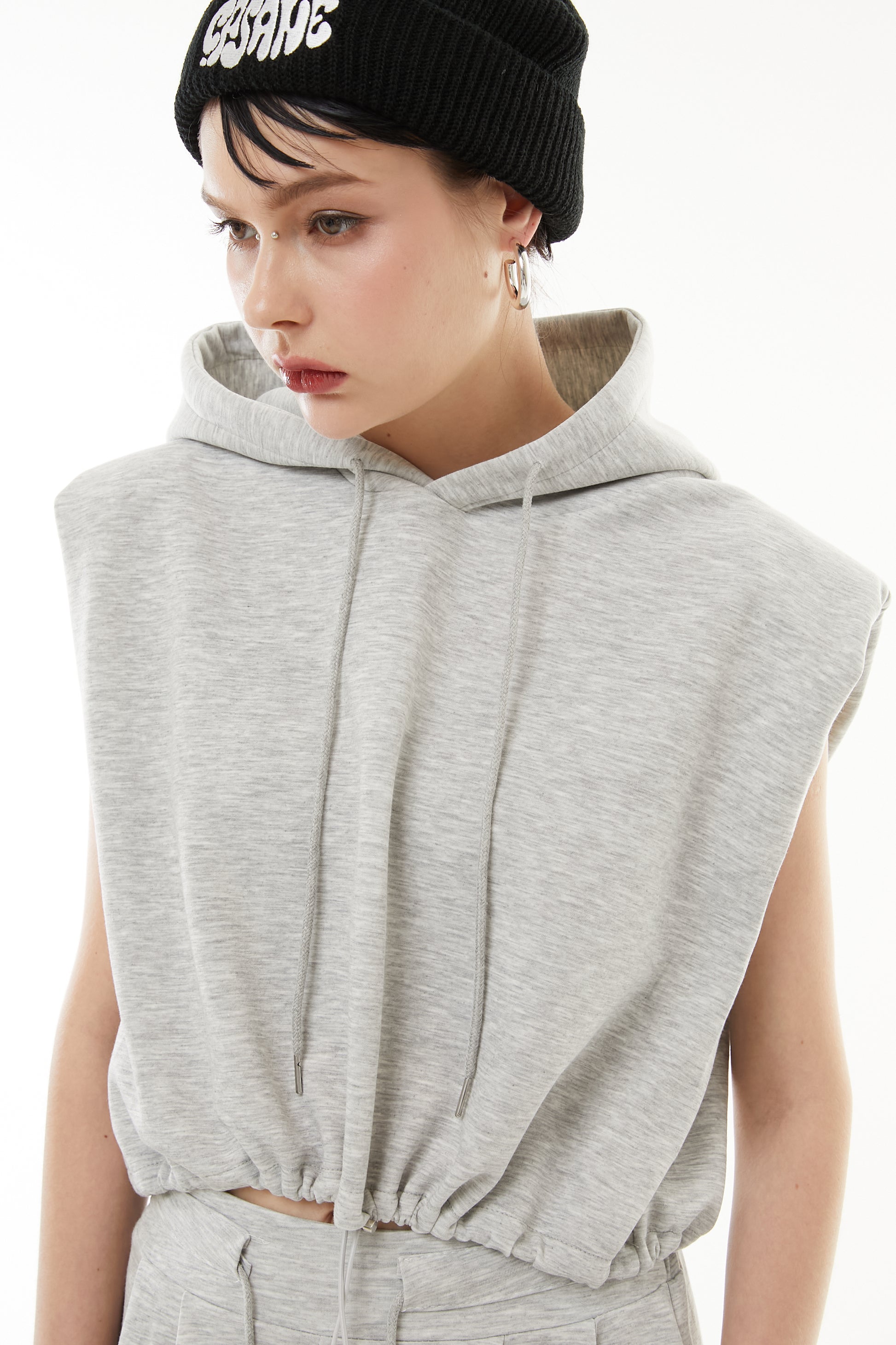 ショートフーディにハイウエストデニムを合わせ、休日感のあるラフスタイルに。タンクトップをインに仕込んで、さりげないレイヤー遊びも◎。
