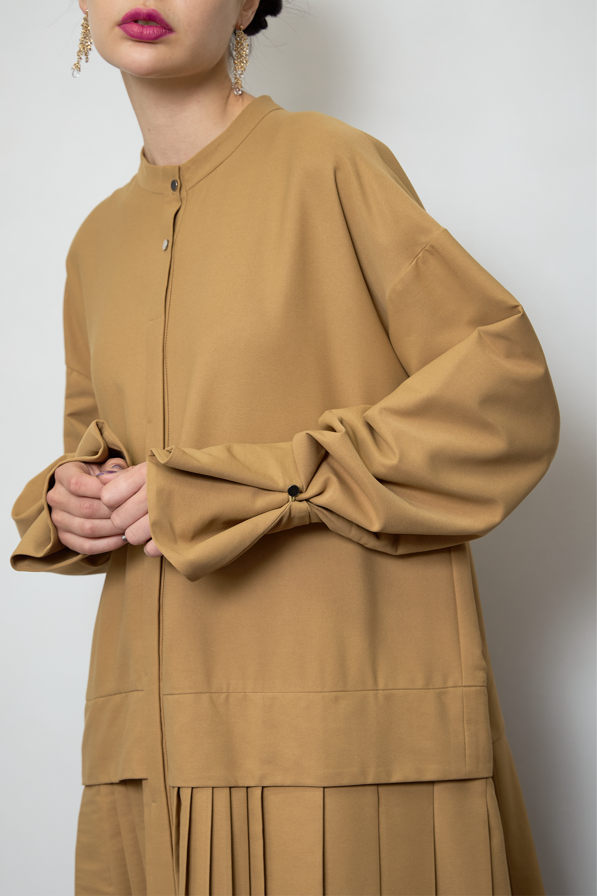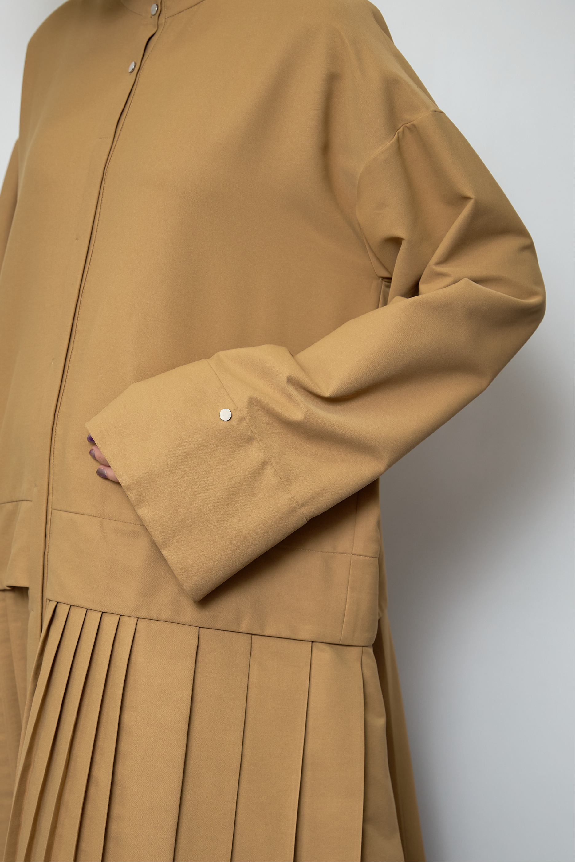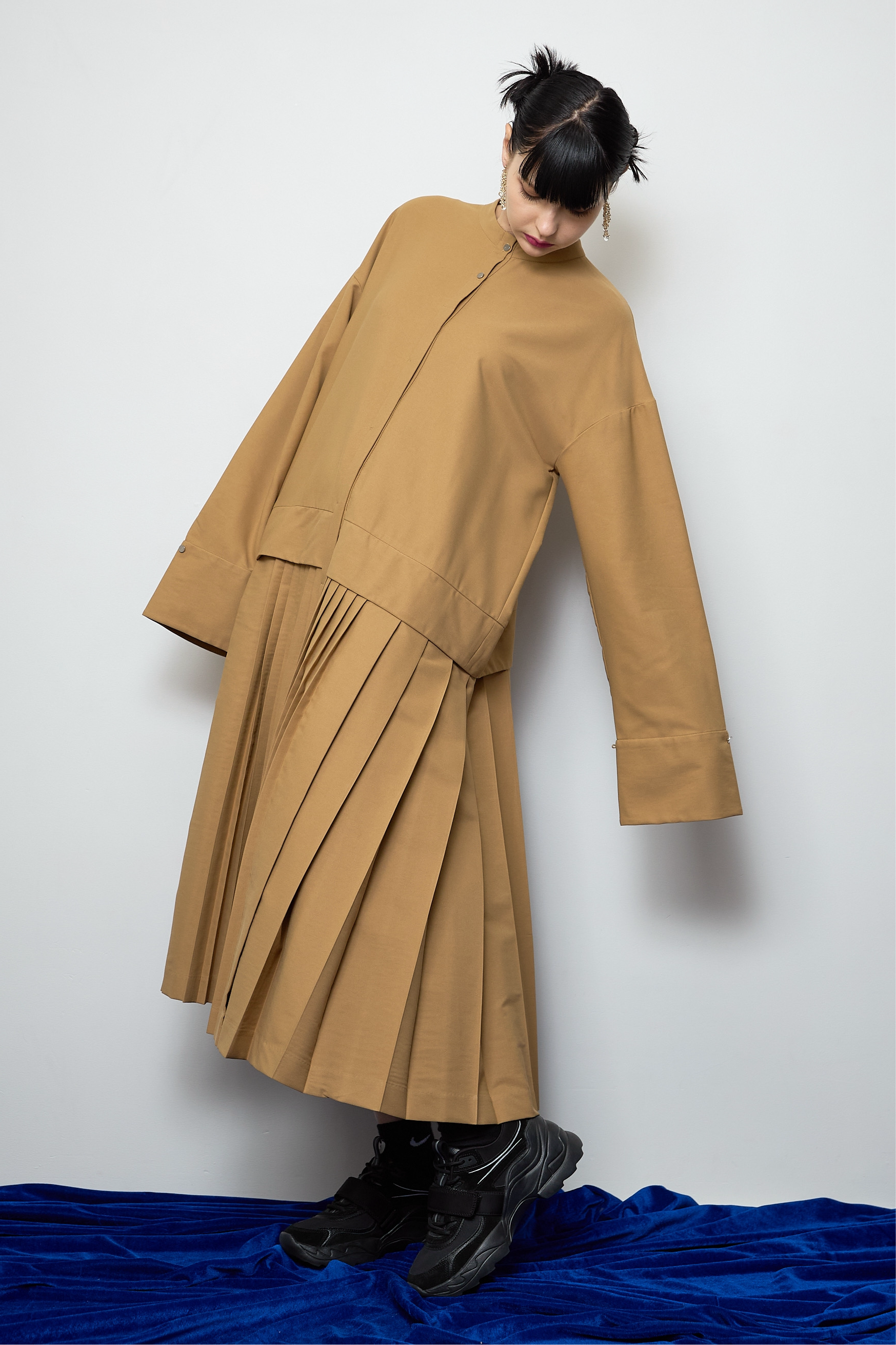 生地のハリを生かしレイヤードデザインを入れ、1枚で重ね着している様なディテールに仕上げました。