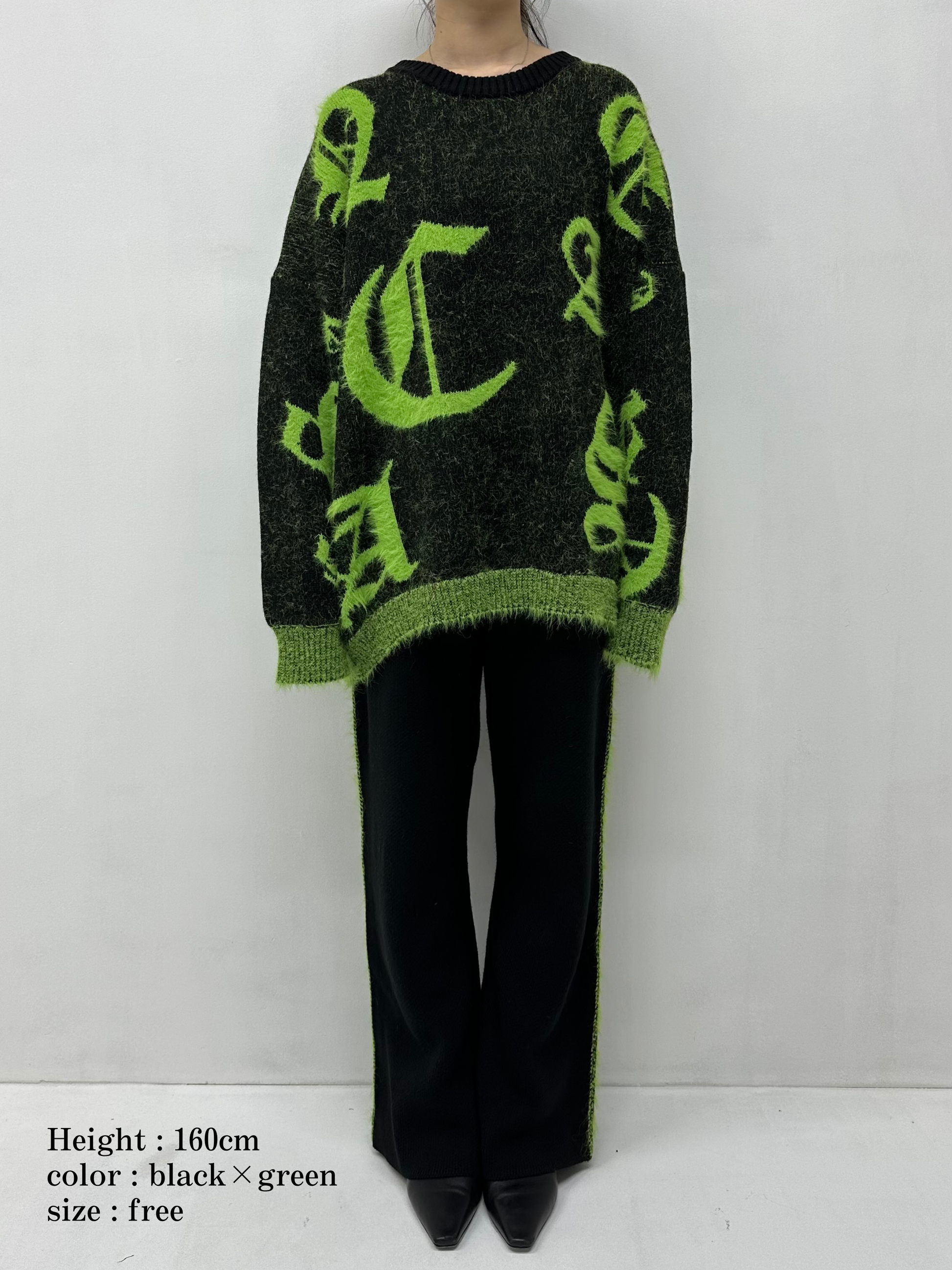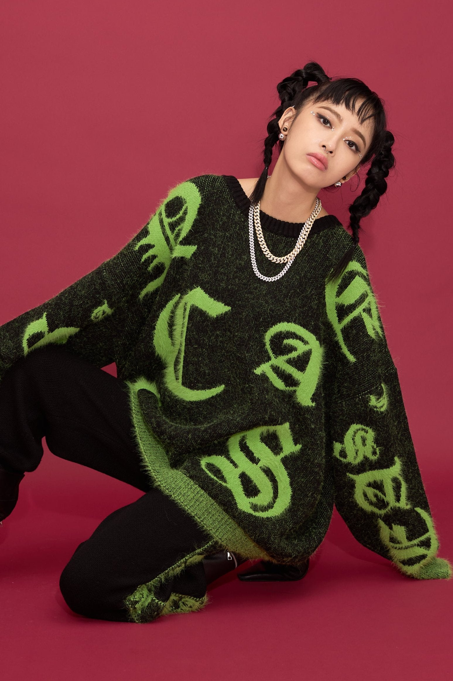 大胆な配色ロゴをランダムにちりばめたデザインのビックシルエットニットです。