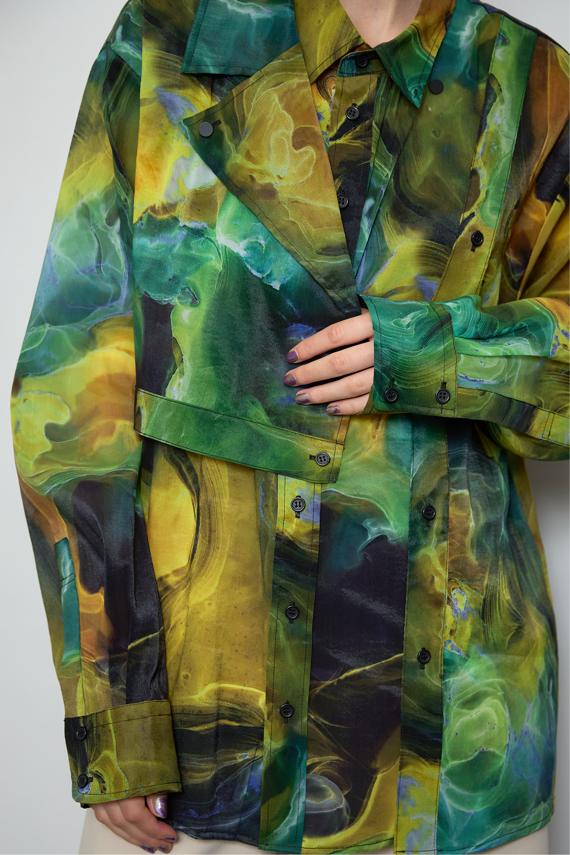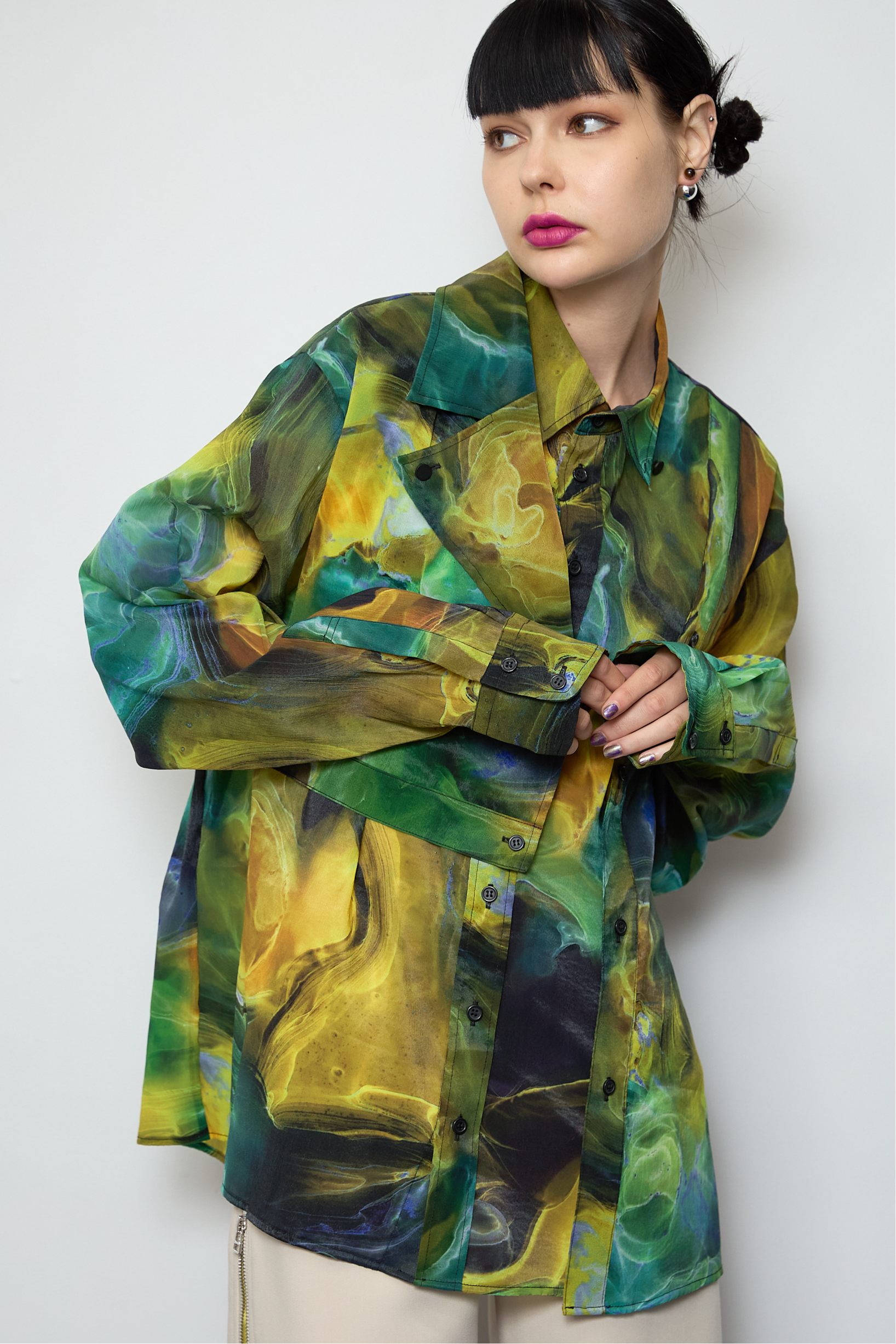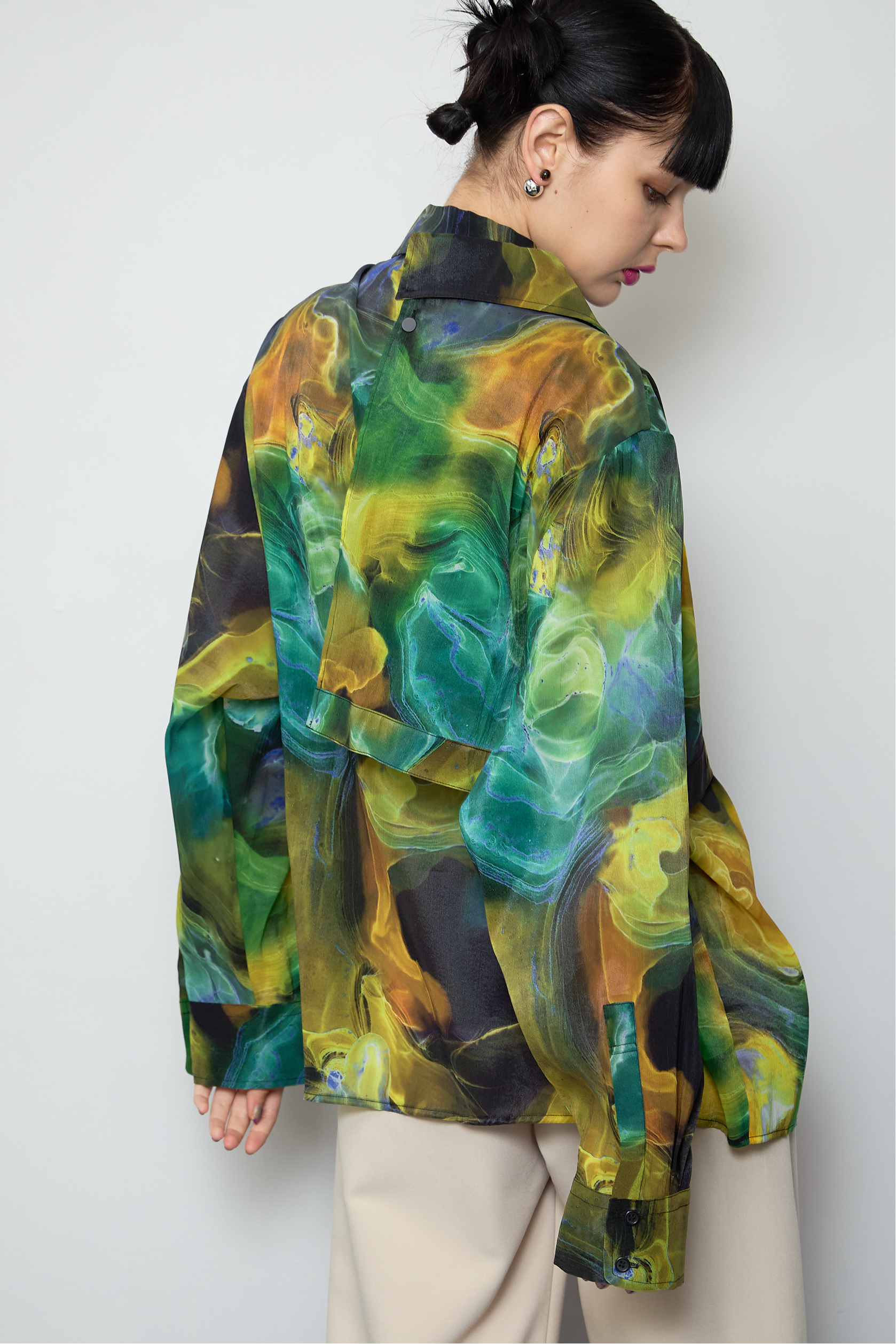 CASANEオリジナル柄プリントが施された透け感のあるメンズライクなシャツです。