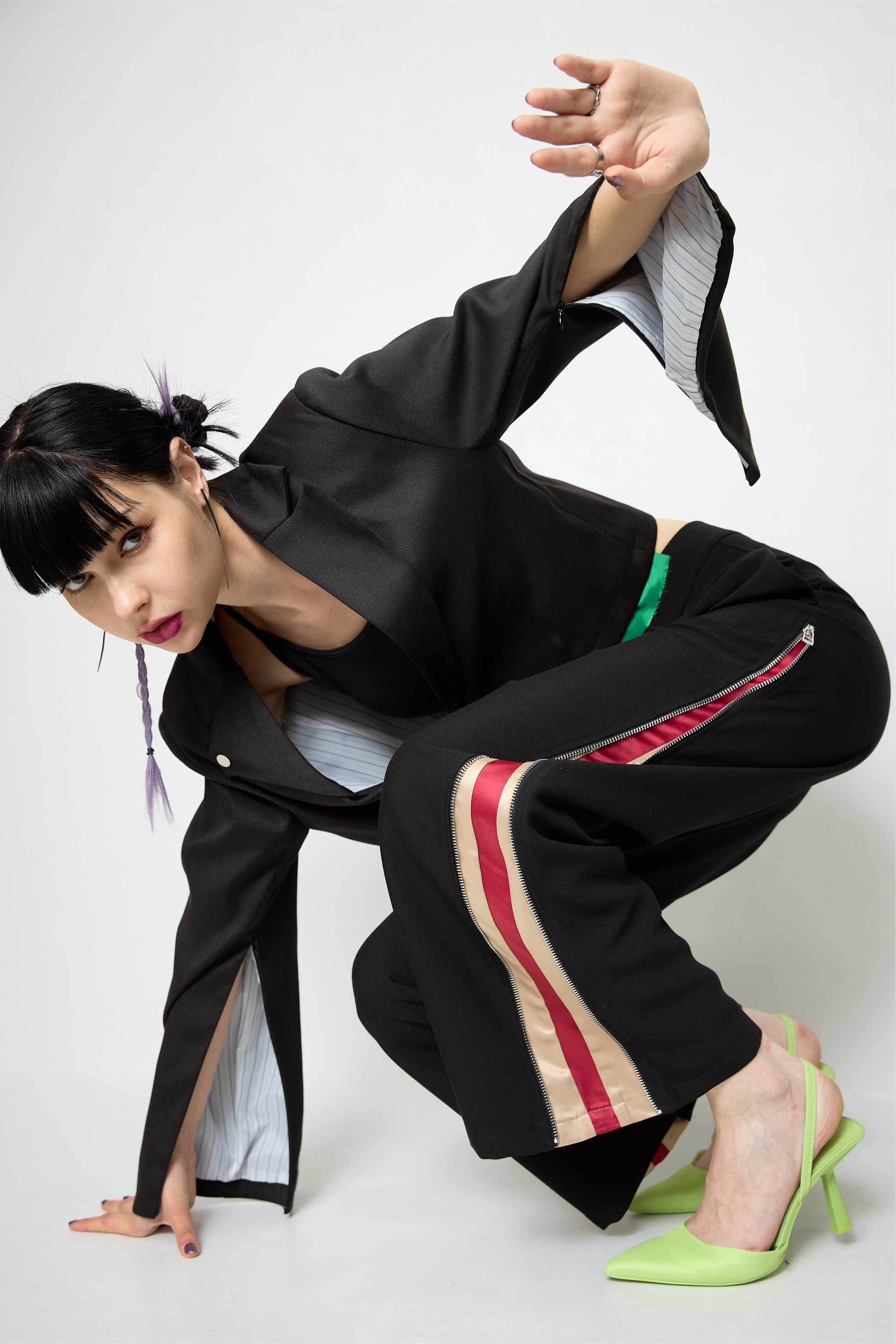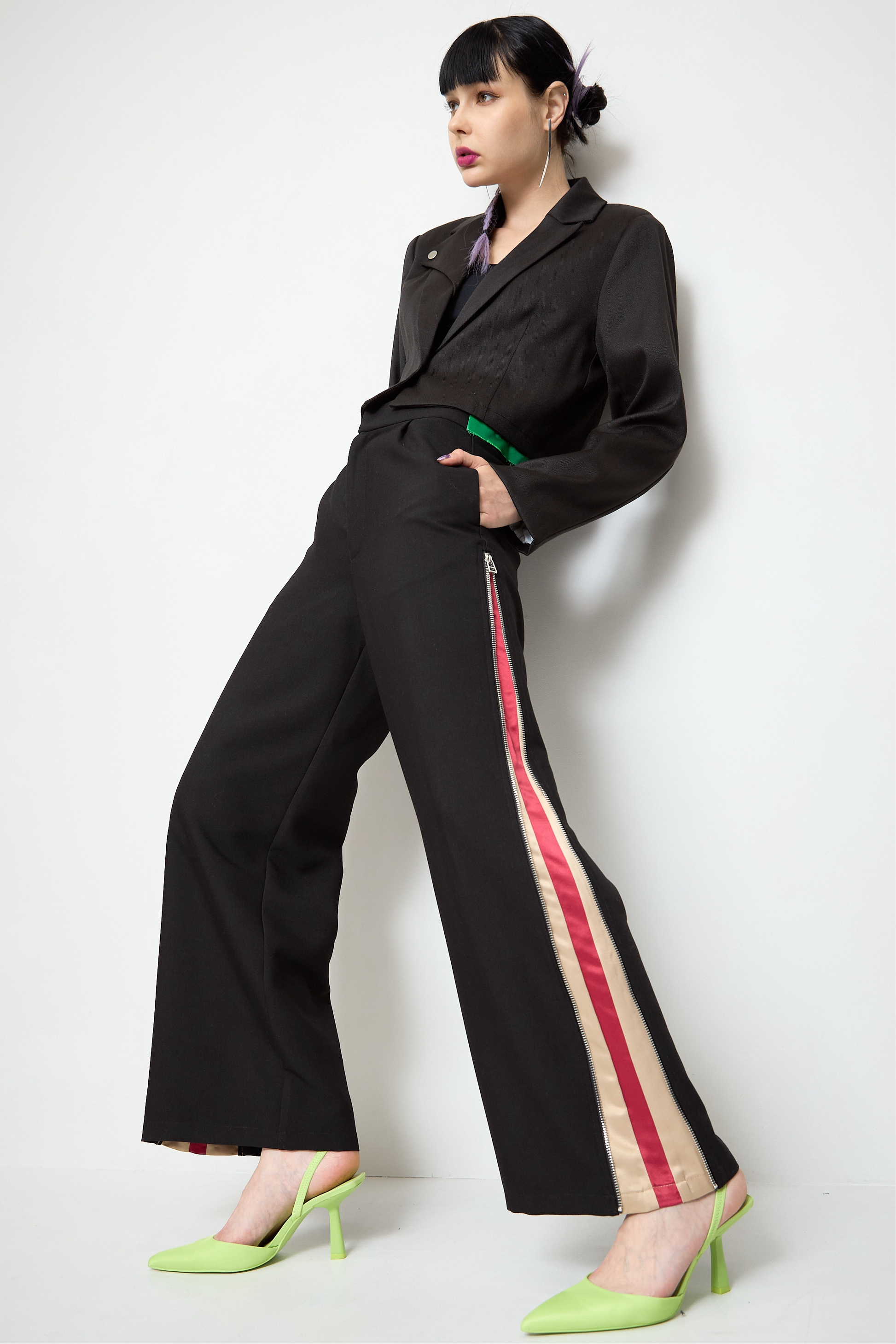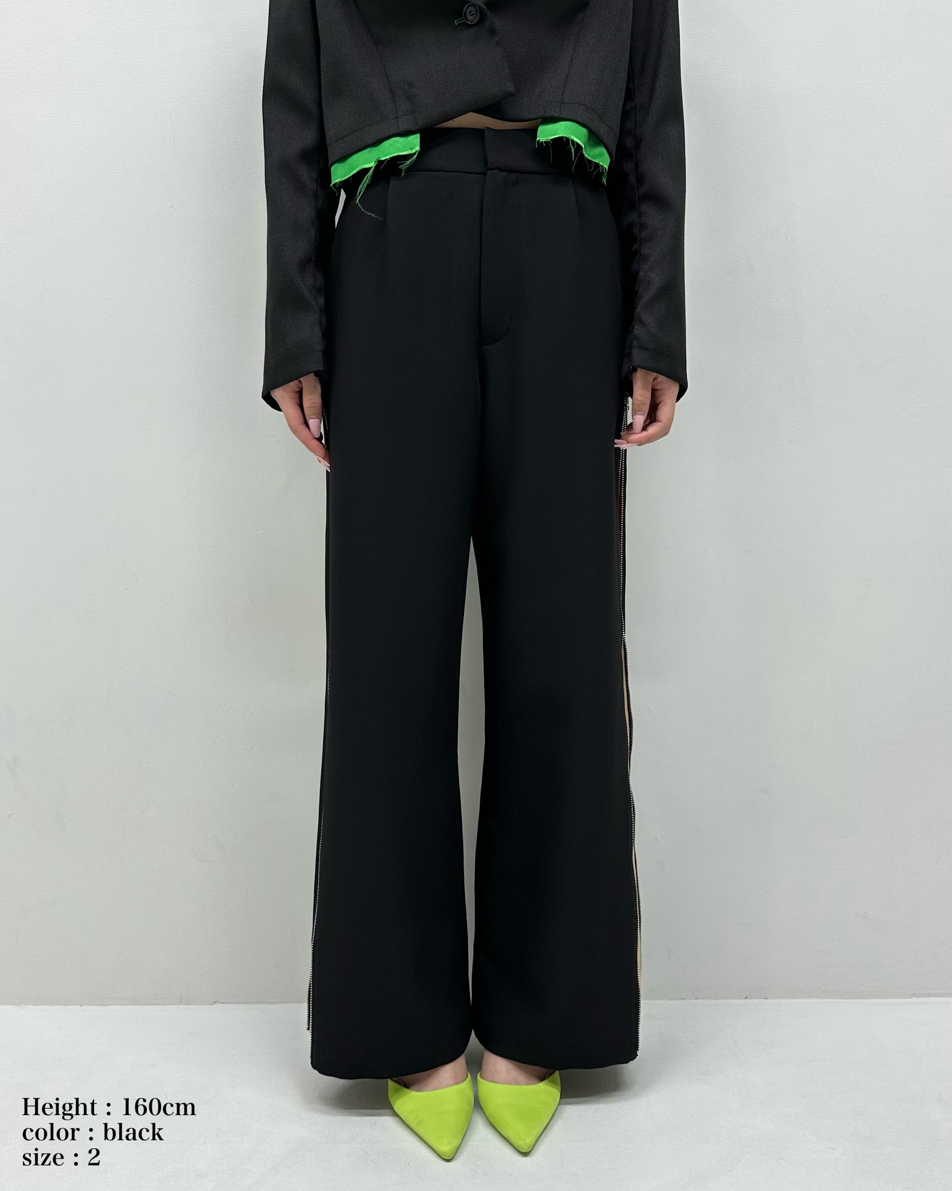 素材はシワになりにくいスーツ素材を使用し、カジュアルダウンさせサイドラインにはアクセントになる光沢のあるサテンでバイカラーにしています。