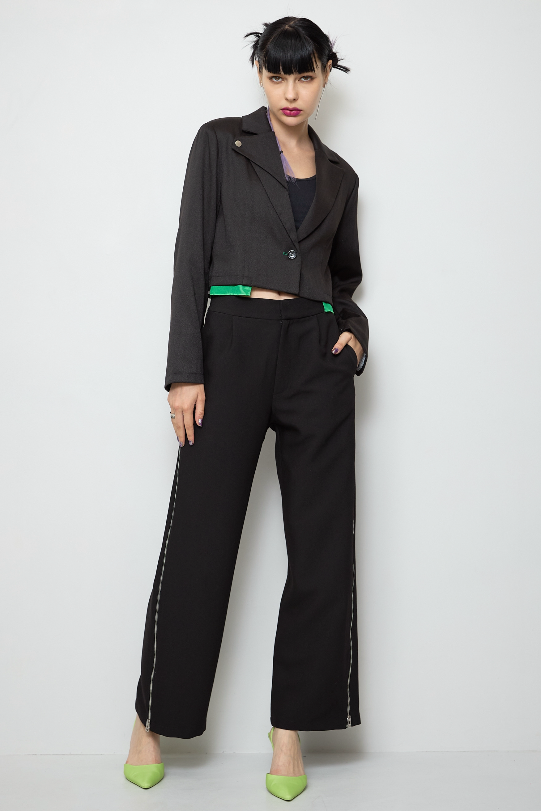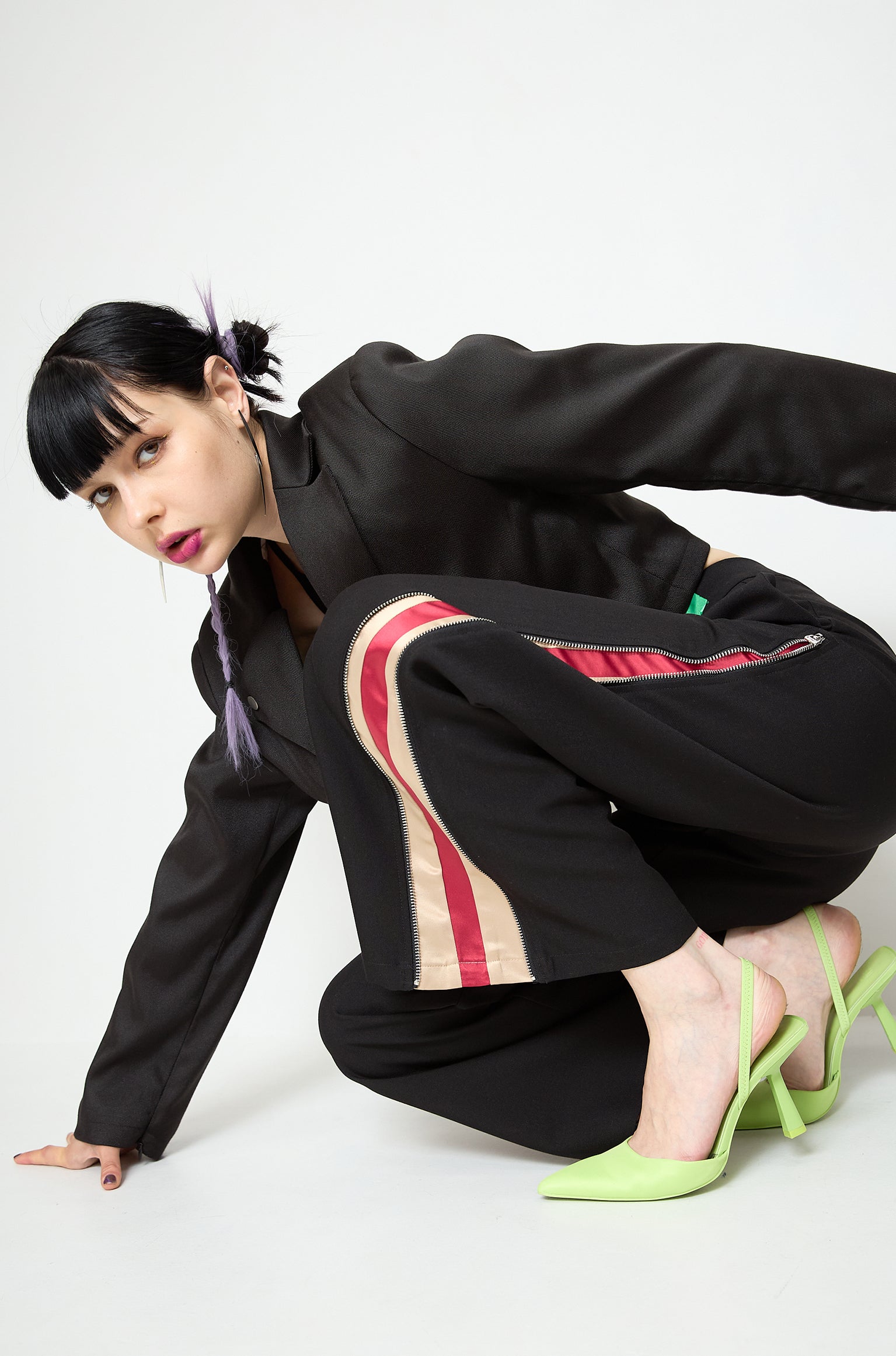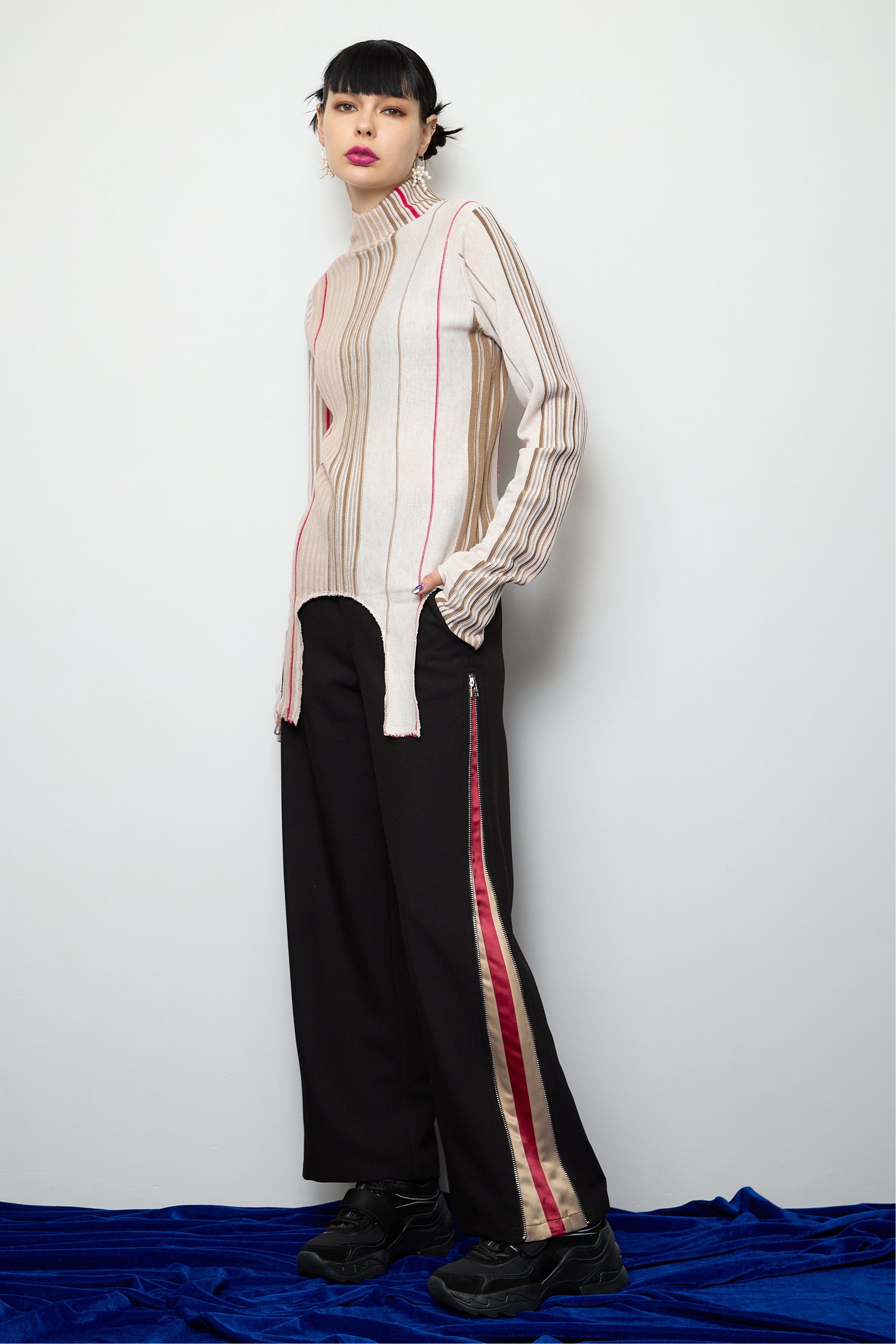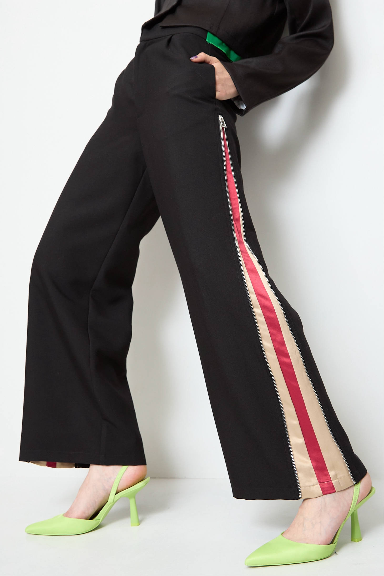 素材はシワになりにくいスーツ素材を使用し、カジュアルダウンさせサイドラインにはアクセントになる光沢のあるサテンでバイカラーにしています。
